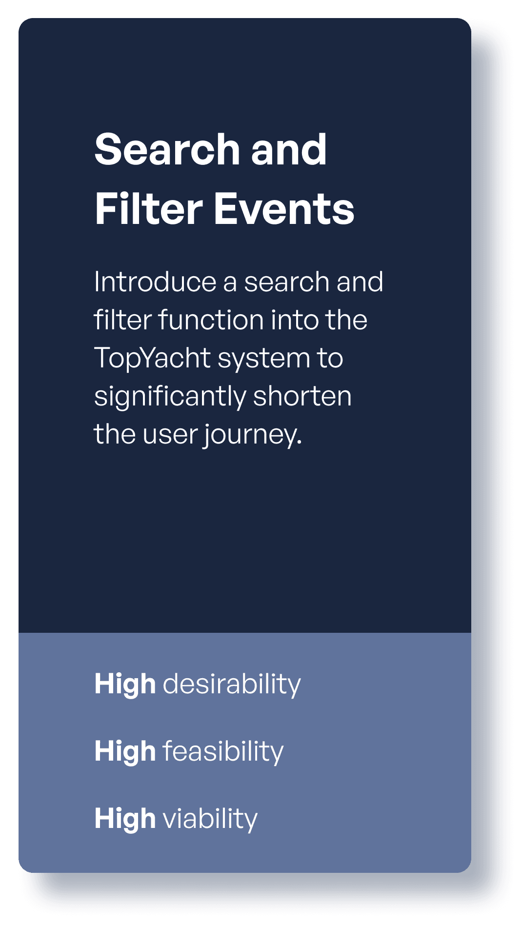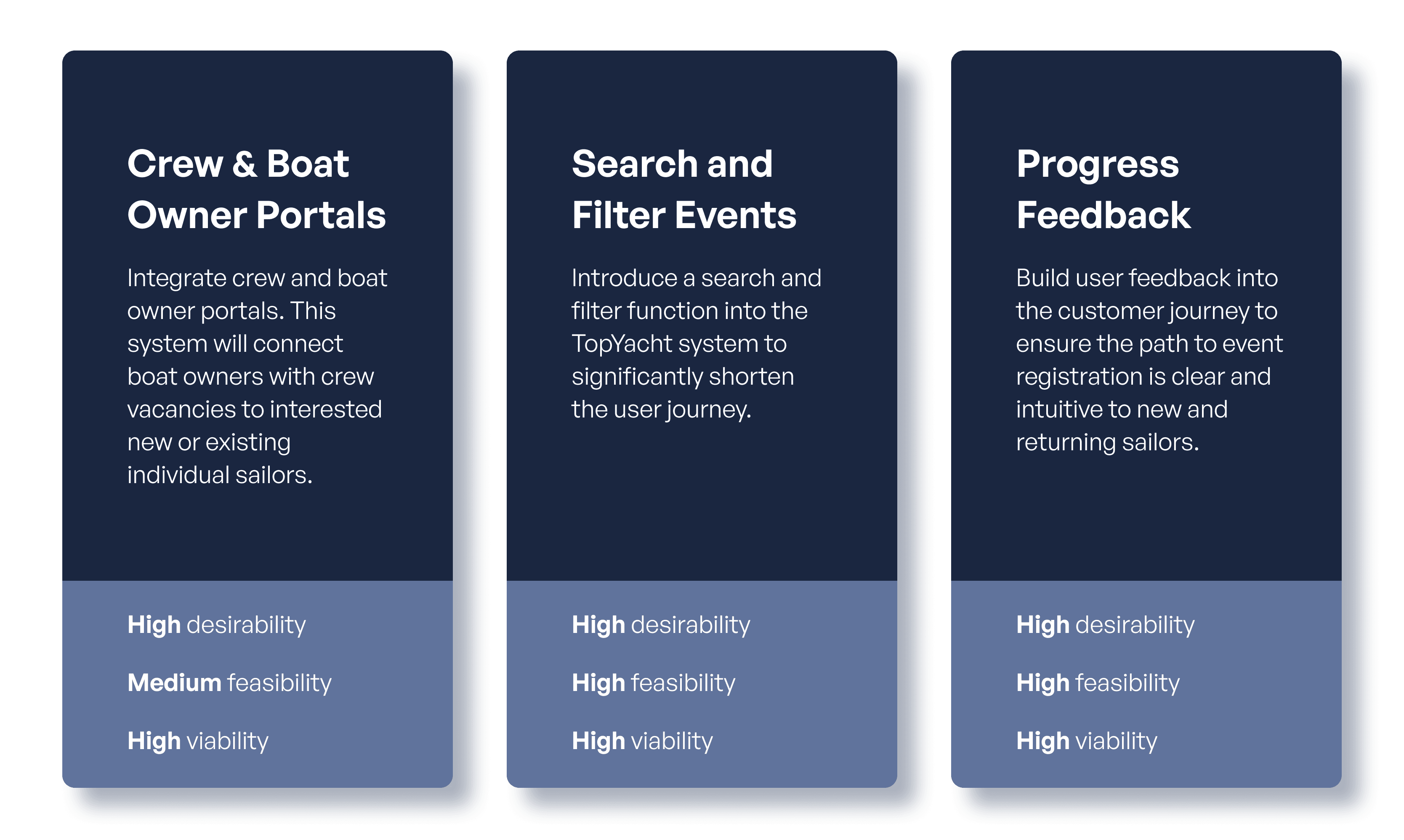 The user-centered design (UCD) framework, balances desirability (what users need most), feasibility (what can be realistically built), and viability (what aligns with business goals). This approach prioritises high-impact improvements, making the redesigned TopYacht platform intuitive, achievable, and valuable for sailors.