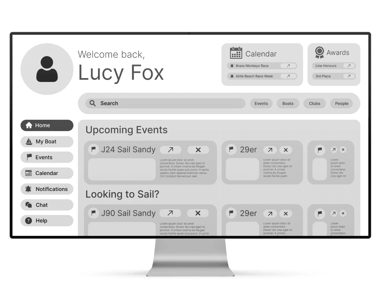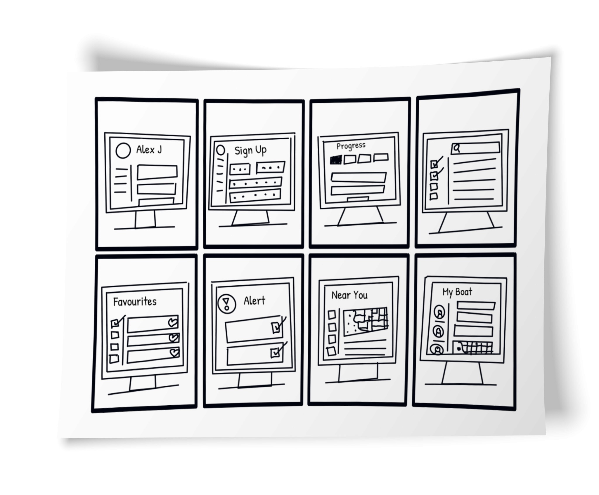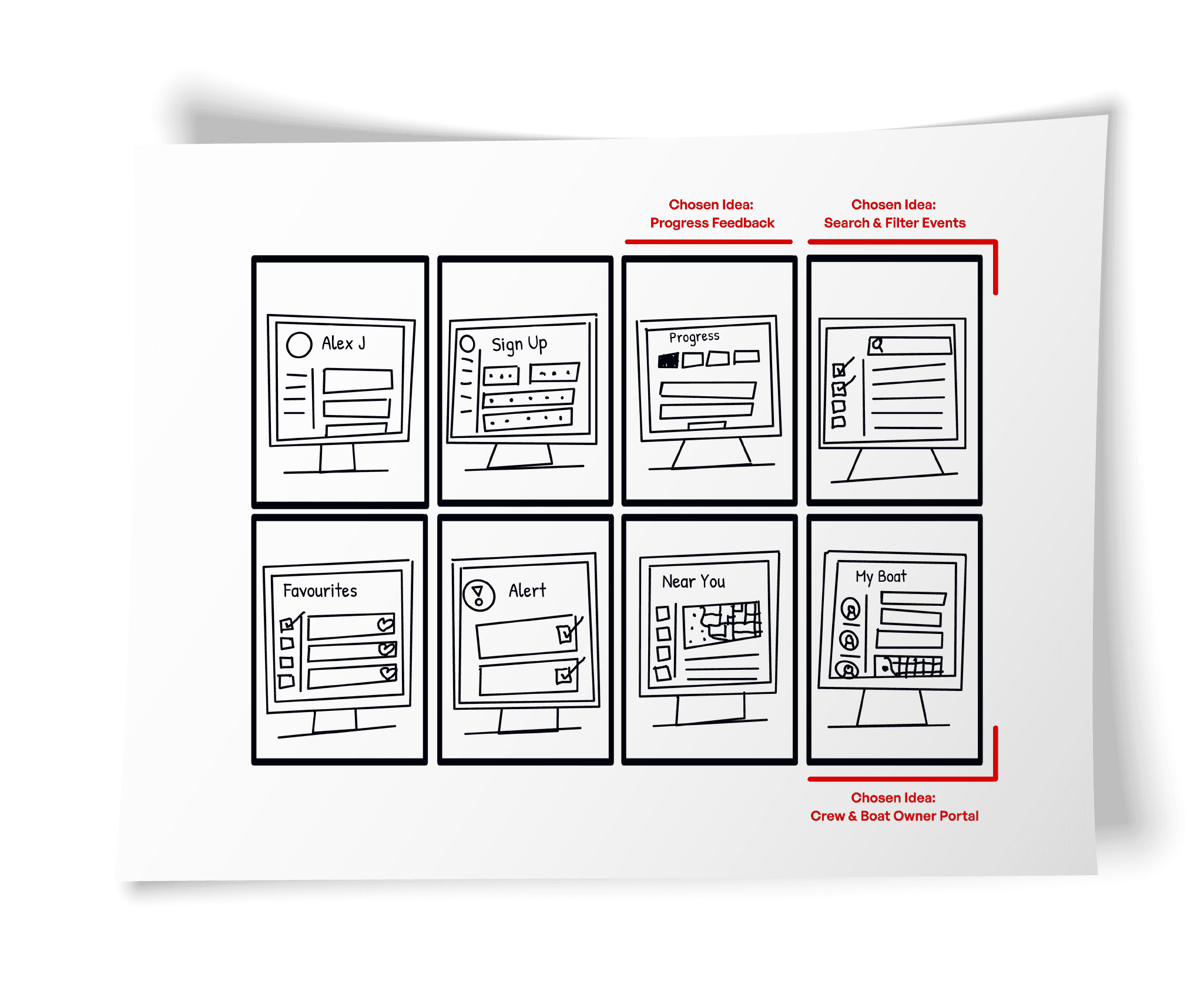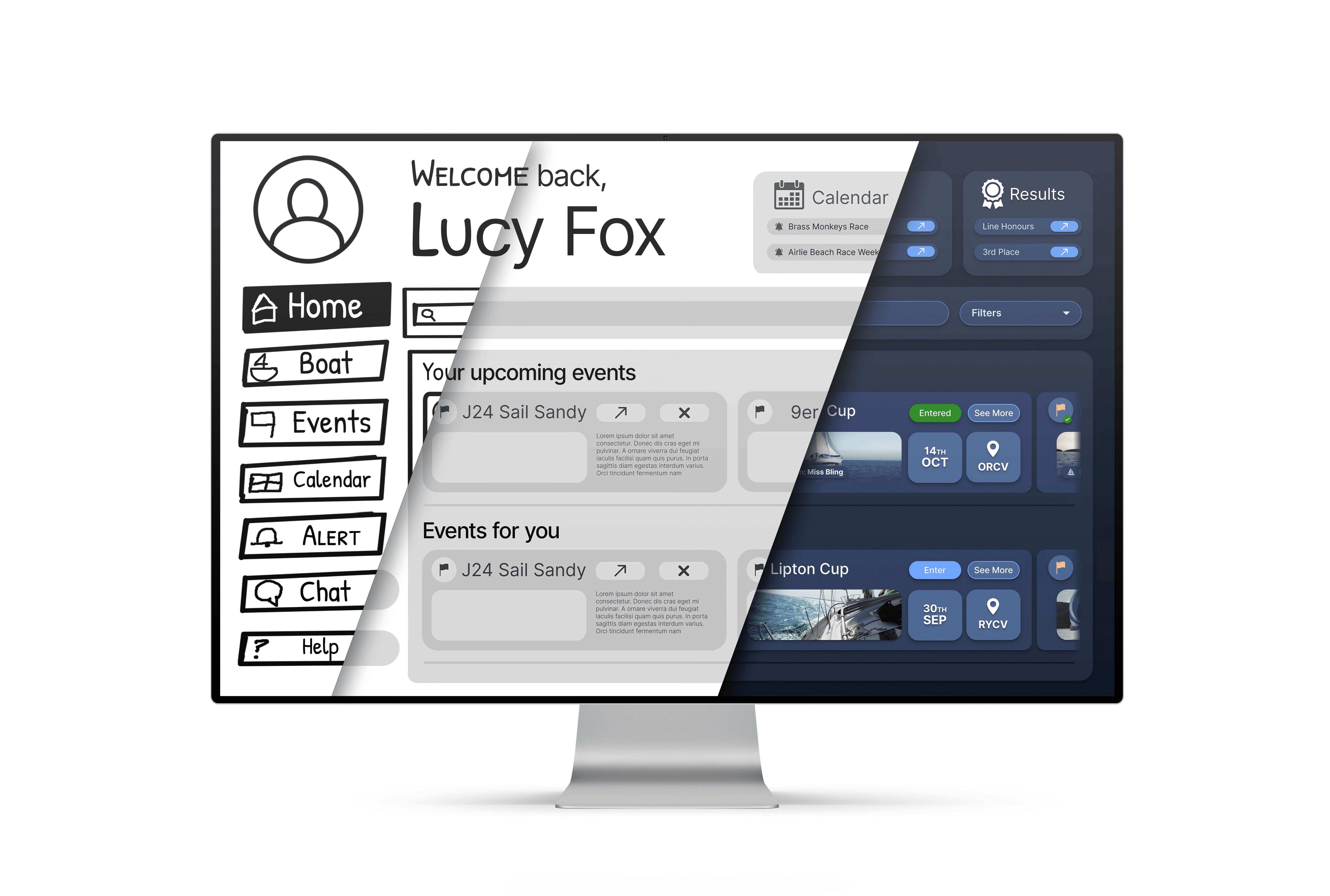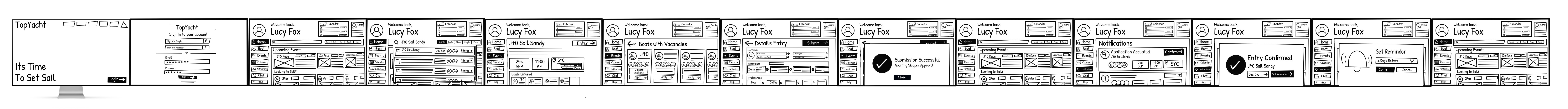 The user journey was mapped to streamline the experience, then rapidly sketched into low-fidelity wireframes to help realise the design solutions. As refinement progressed into mid-fidelity prototypes, the design came to life - streamlining navigation, eliminating clutter, and transforming TopYacht into a sleek, intuitive experience ready for the prototype's first real-world user testing.
