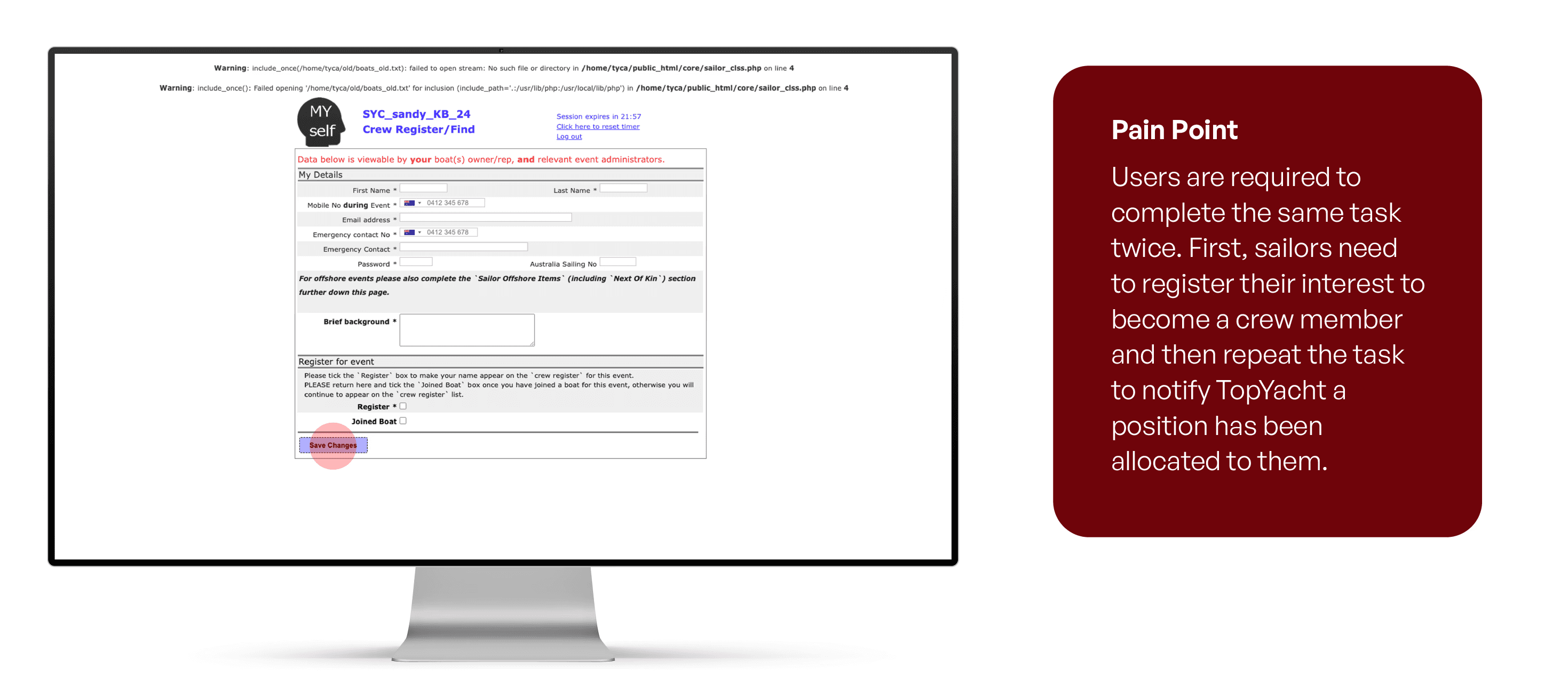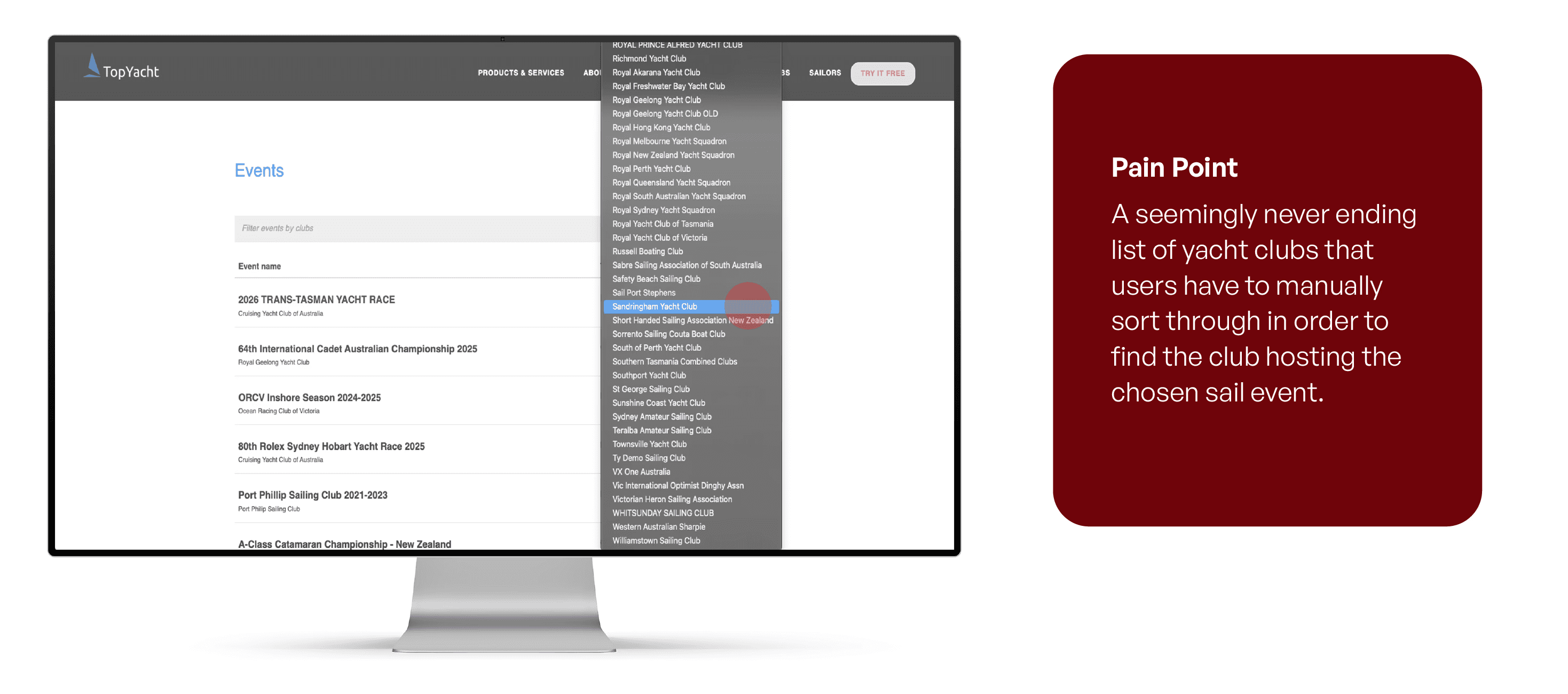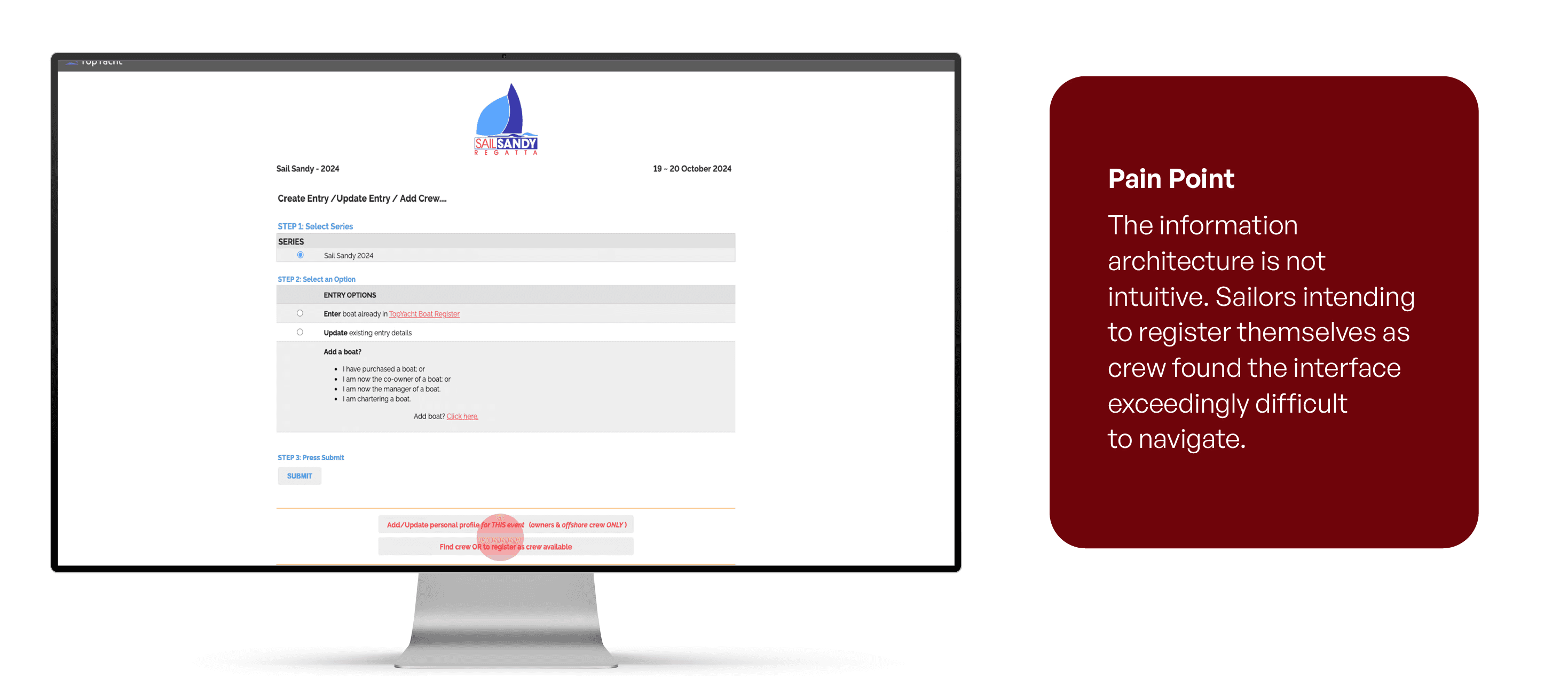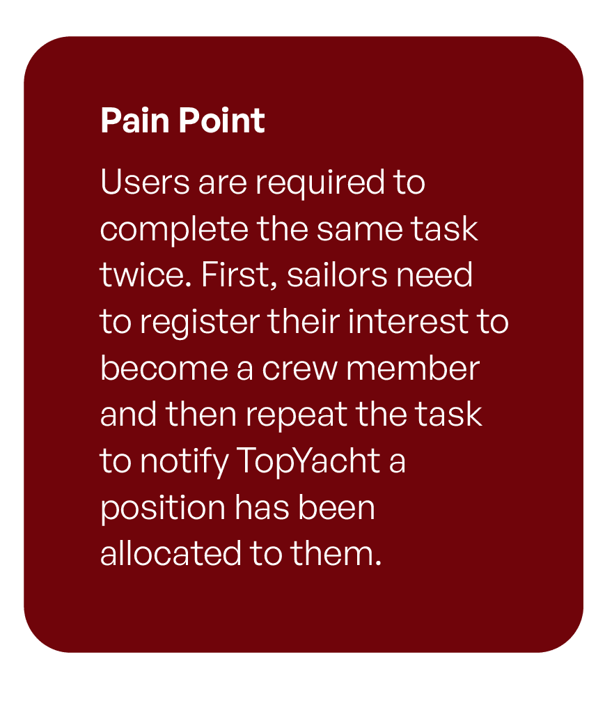 TopYacht is a race registration and management platform used by sailing clubs and event organisers to handle entries, crew lists, and race results. Despite its functionality, the platform suffers from an outdated UI, overwhelming lists, repetitive processes, and a frustrating user experience that slows sailors down.