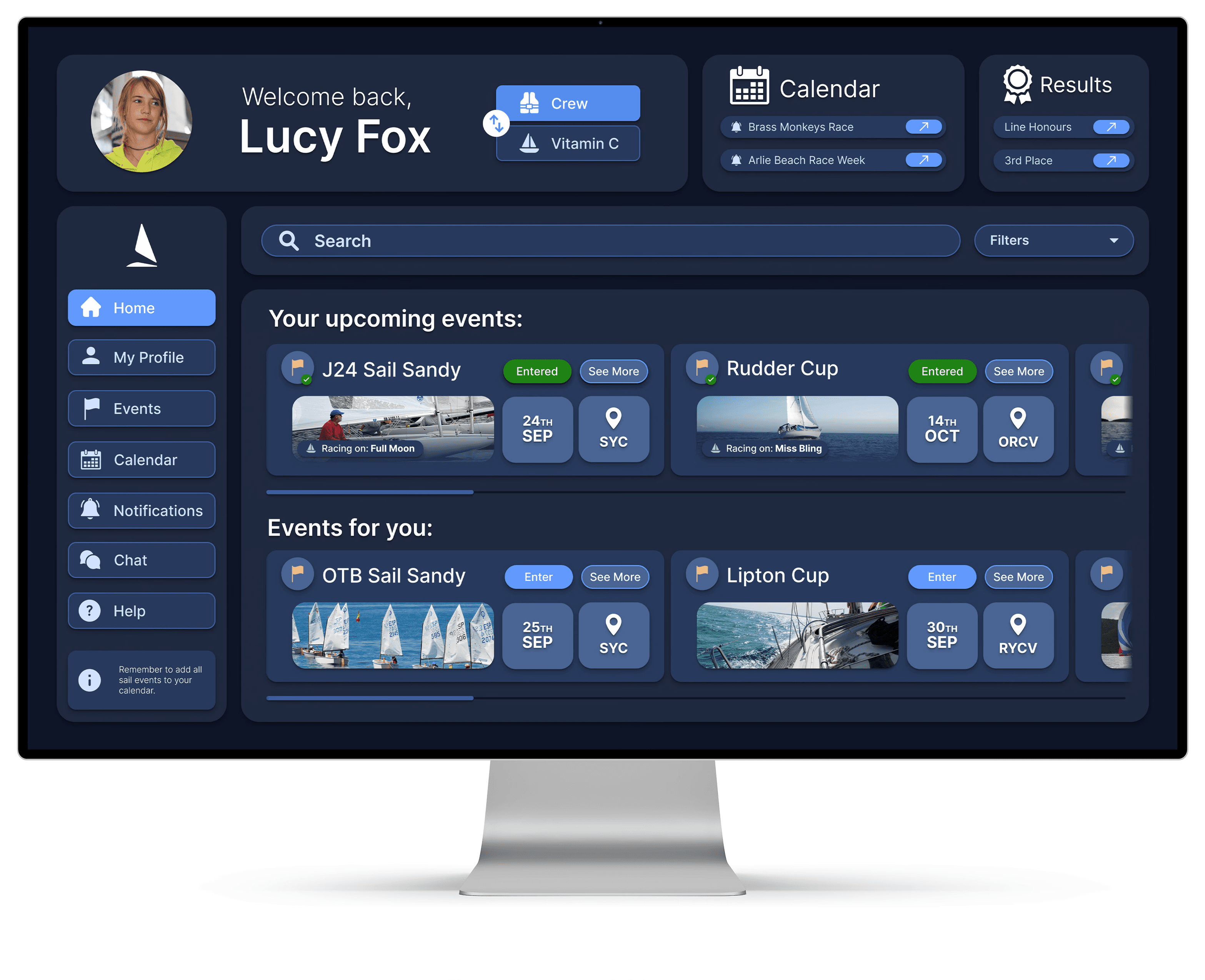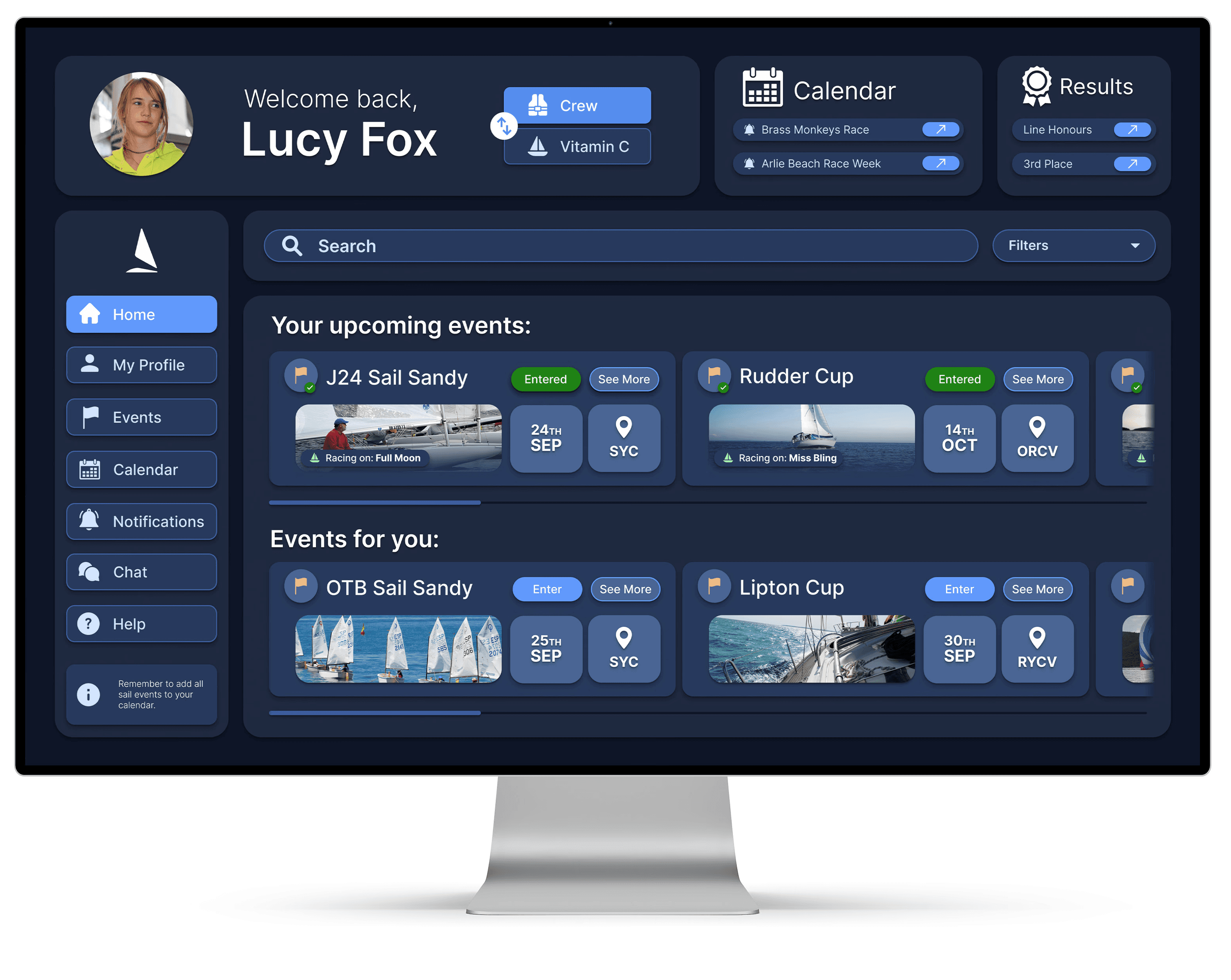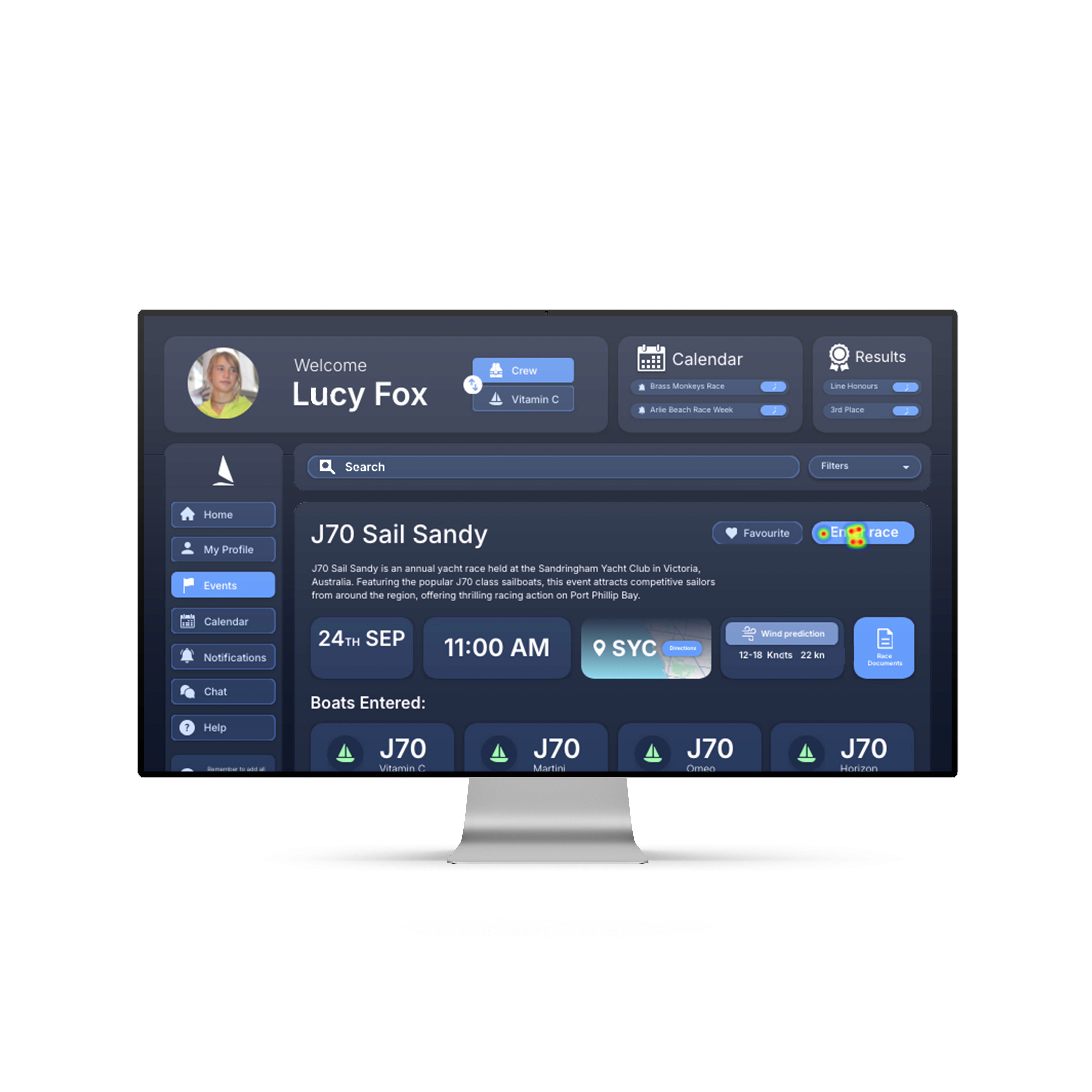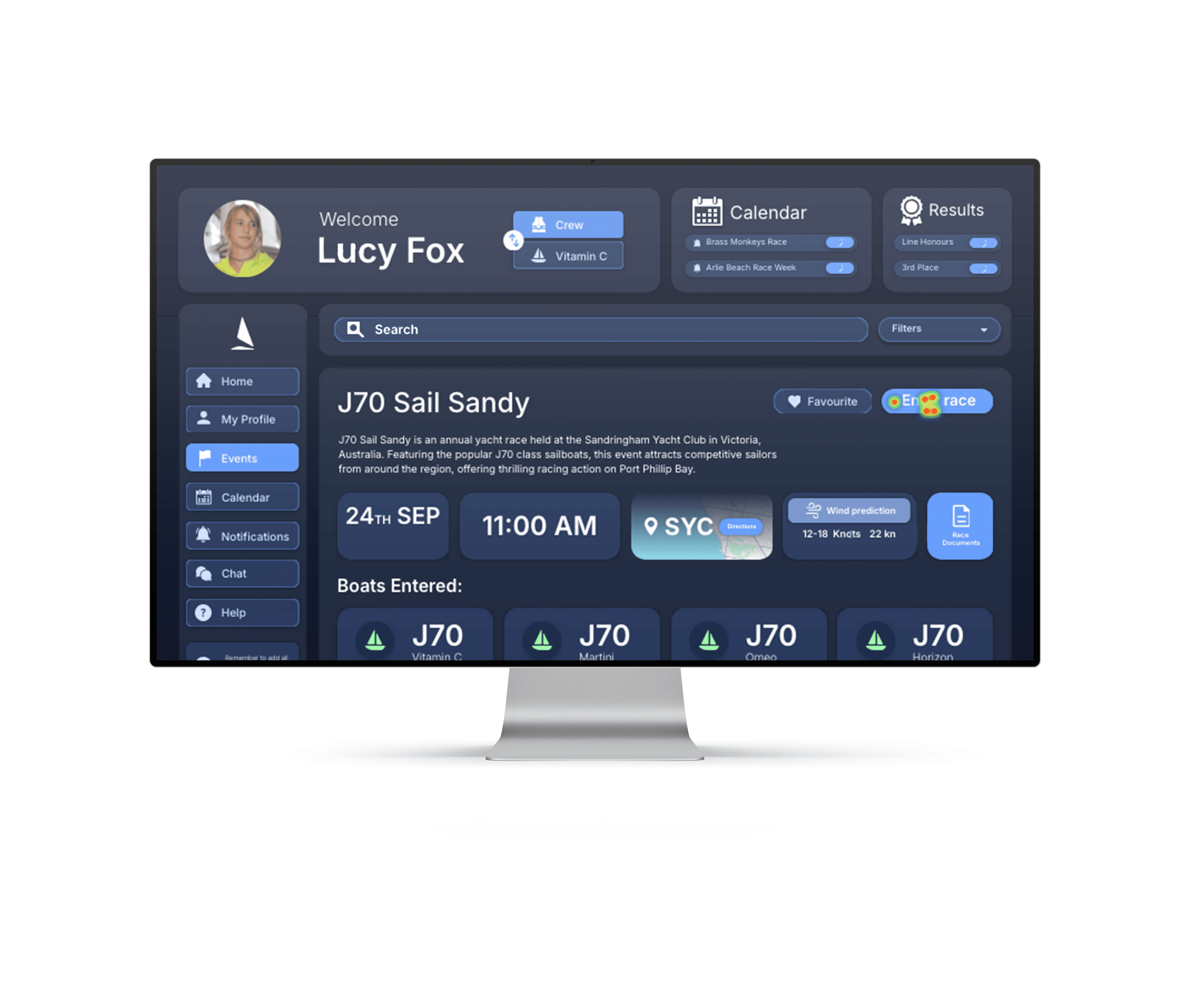 The search and filter event function improves user flow and information architecture by enabling sailors to quickly find relevant races without sifting through endless lists.