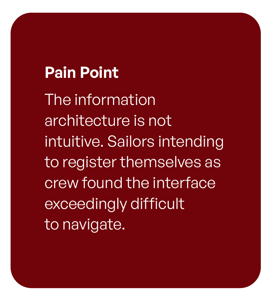It is evident that little investment was made to prioritise and streamline the customers’ experience when performing crew registrations. User testing highlighted that the platform was riddled with pain points and poor information architecture diluted an already visually confusing and outdated interface.