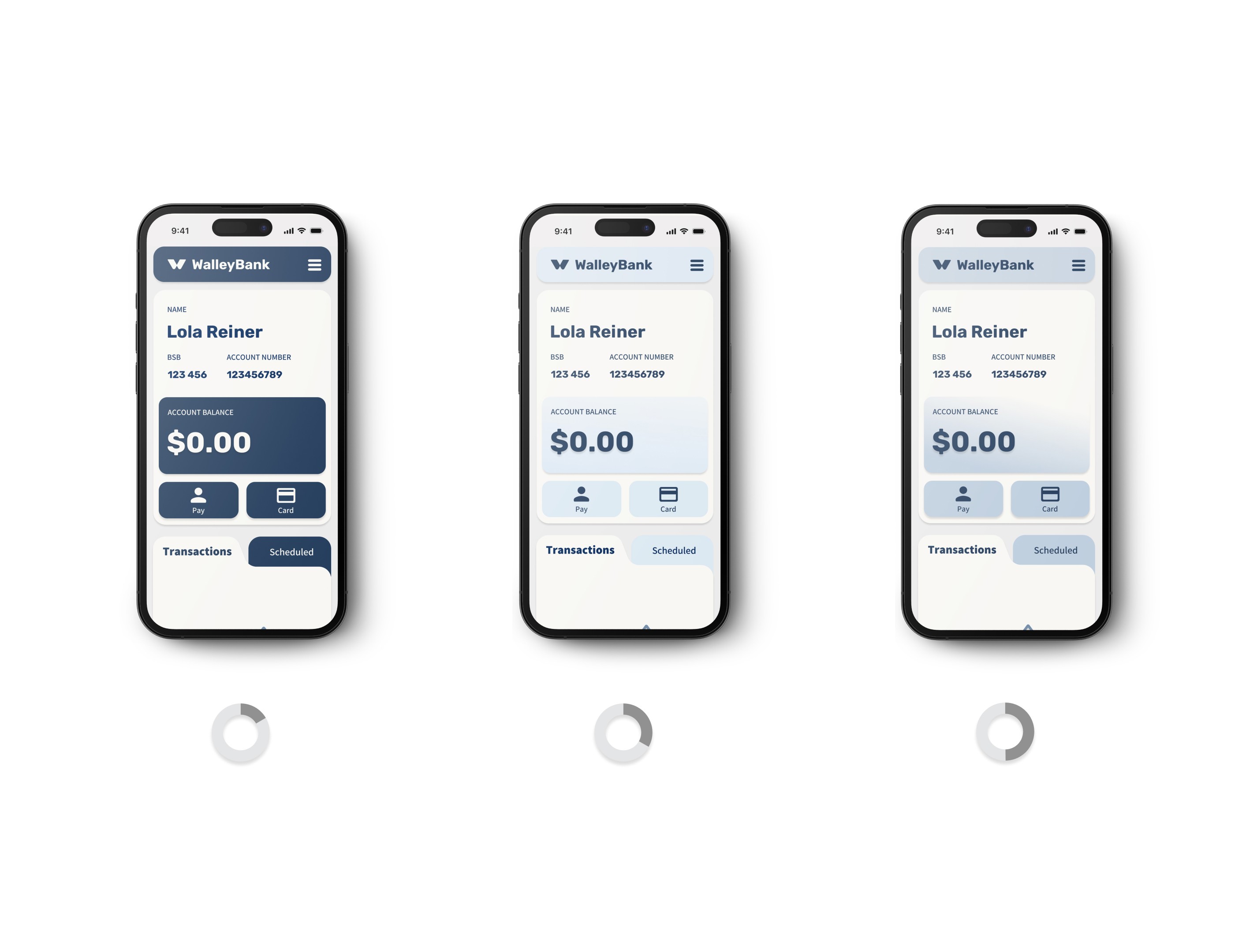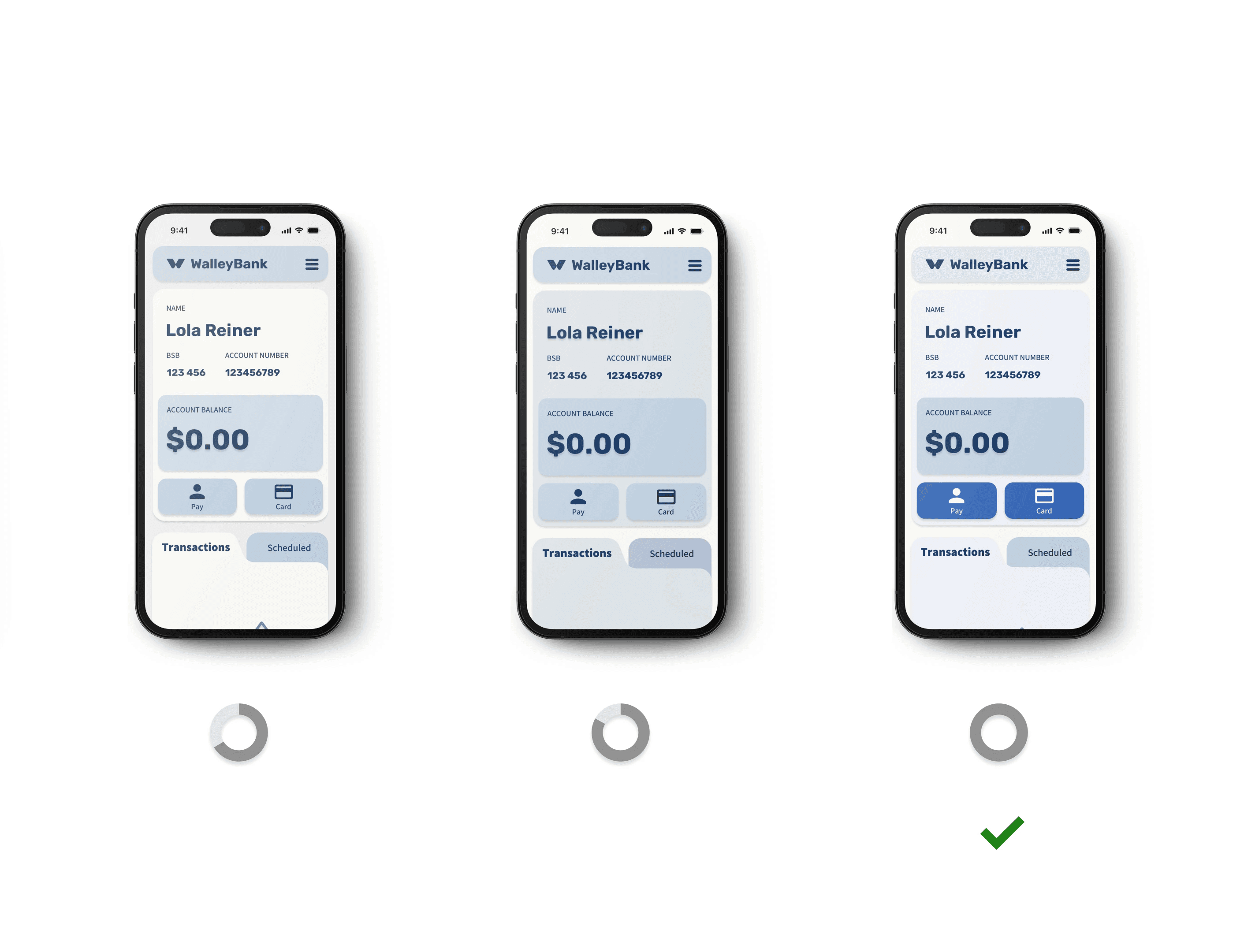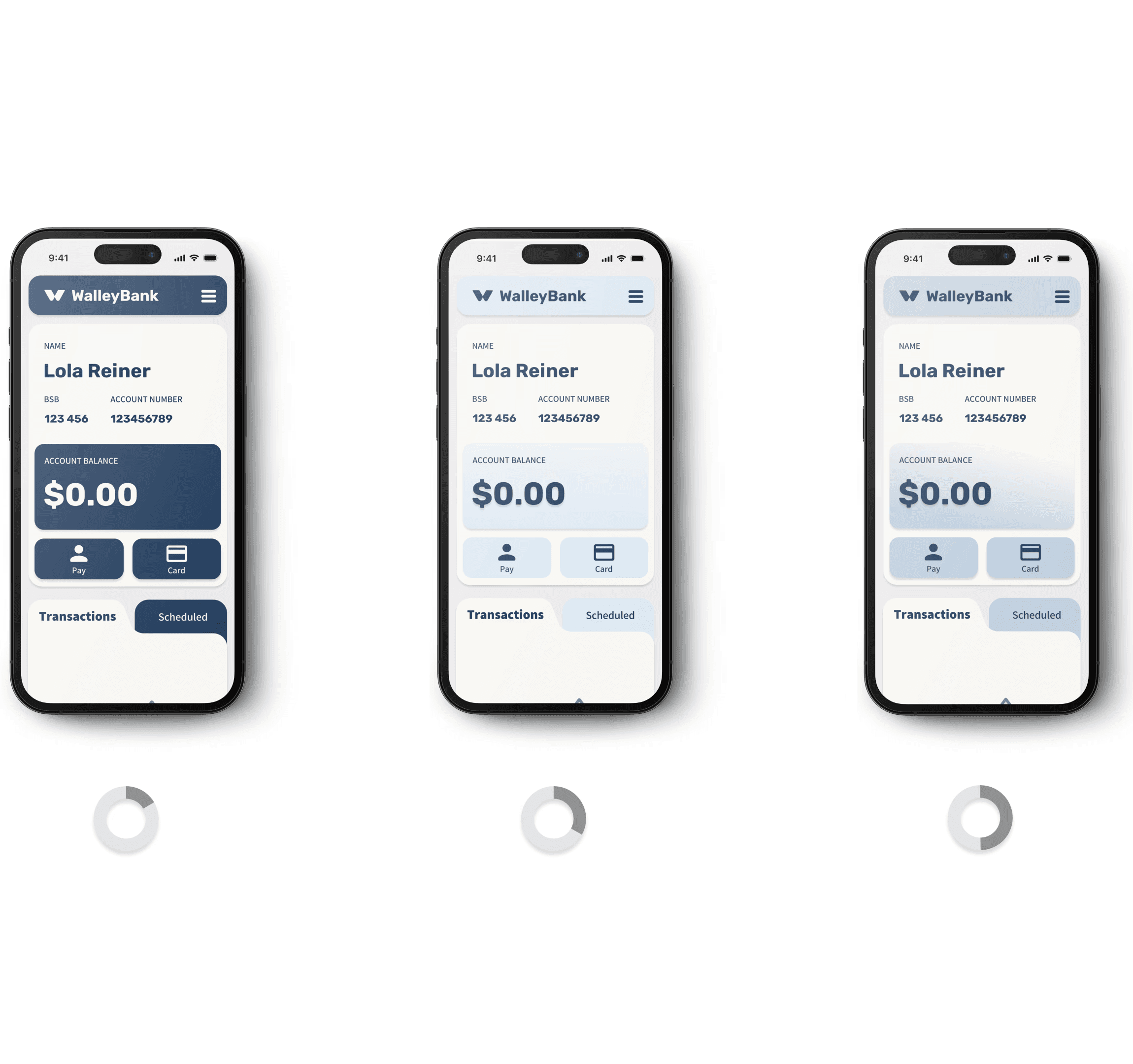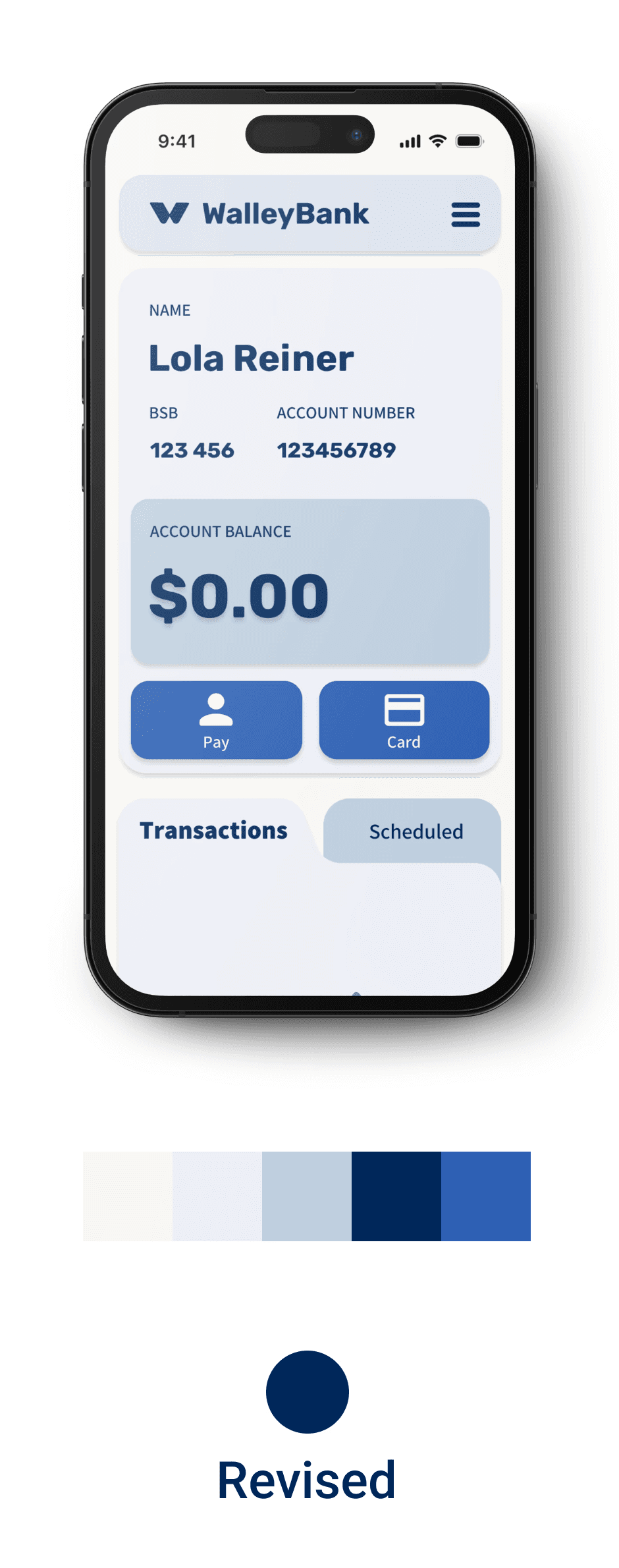 I began by listening to users to uncover the root of the issue. The existing colour scheme created confusion, lacking the clarity and trust typically associated with effective banking interfaces. Users expressed a clear preference for blue, a colour widely recognised for its association with reliability, professionalism, and financial security — making it a stronger fit for WalleyBank’s brand goals.