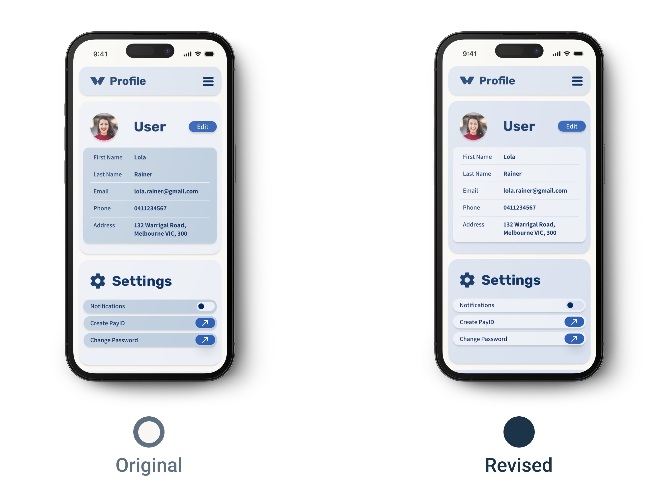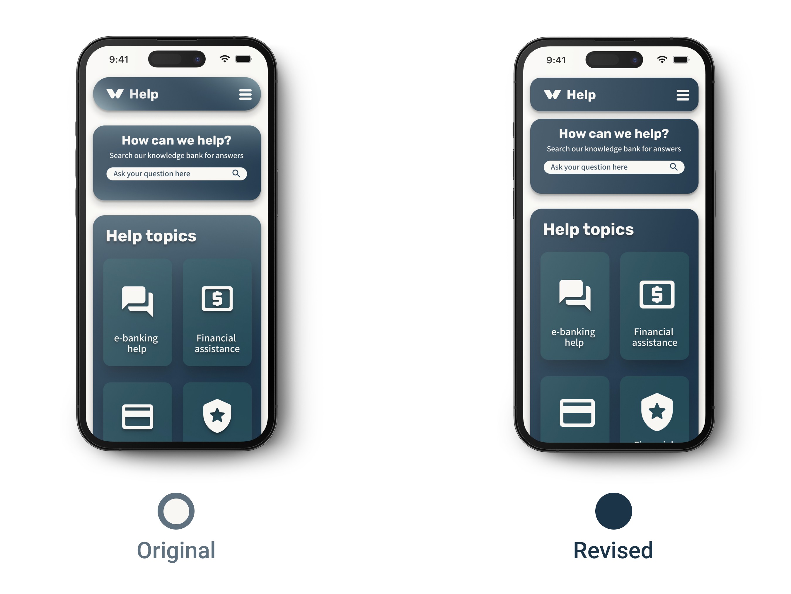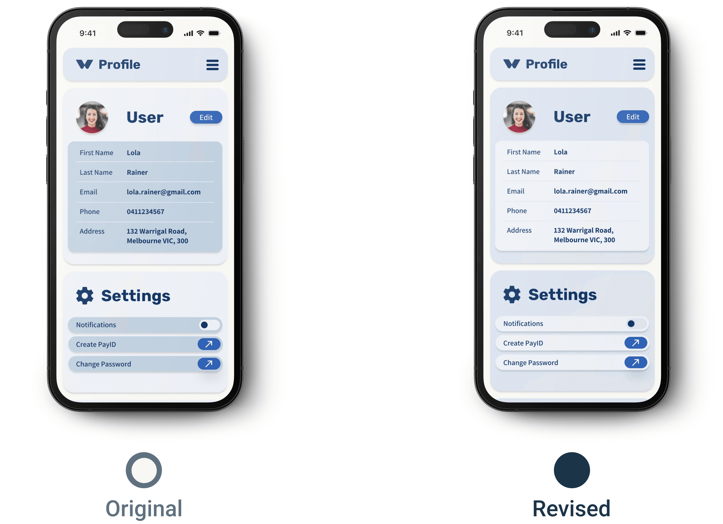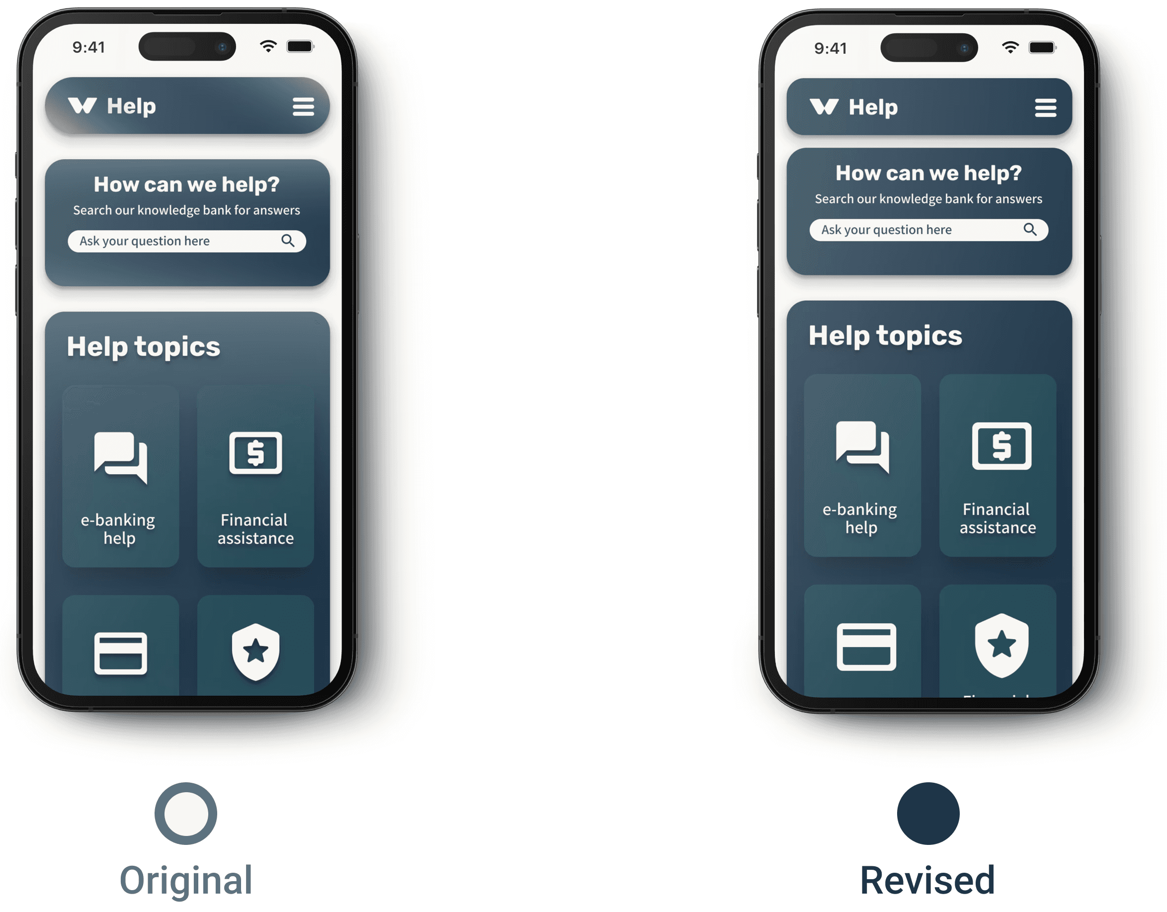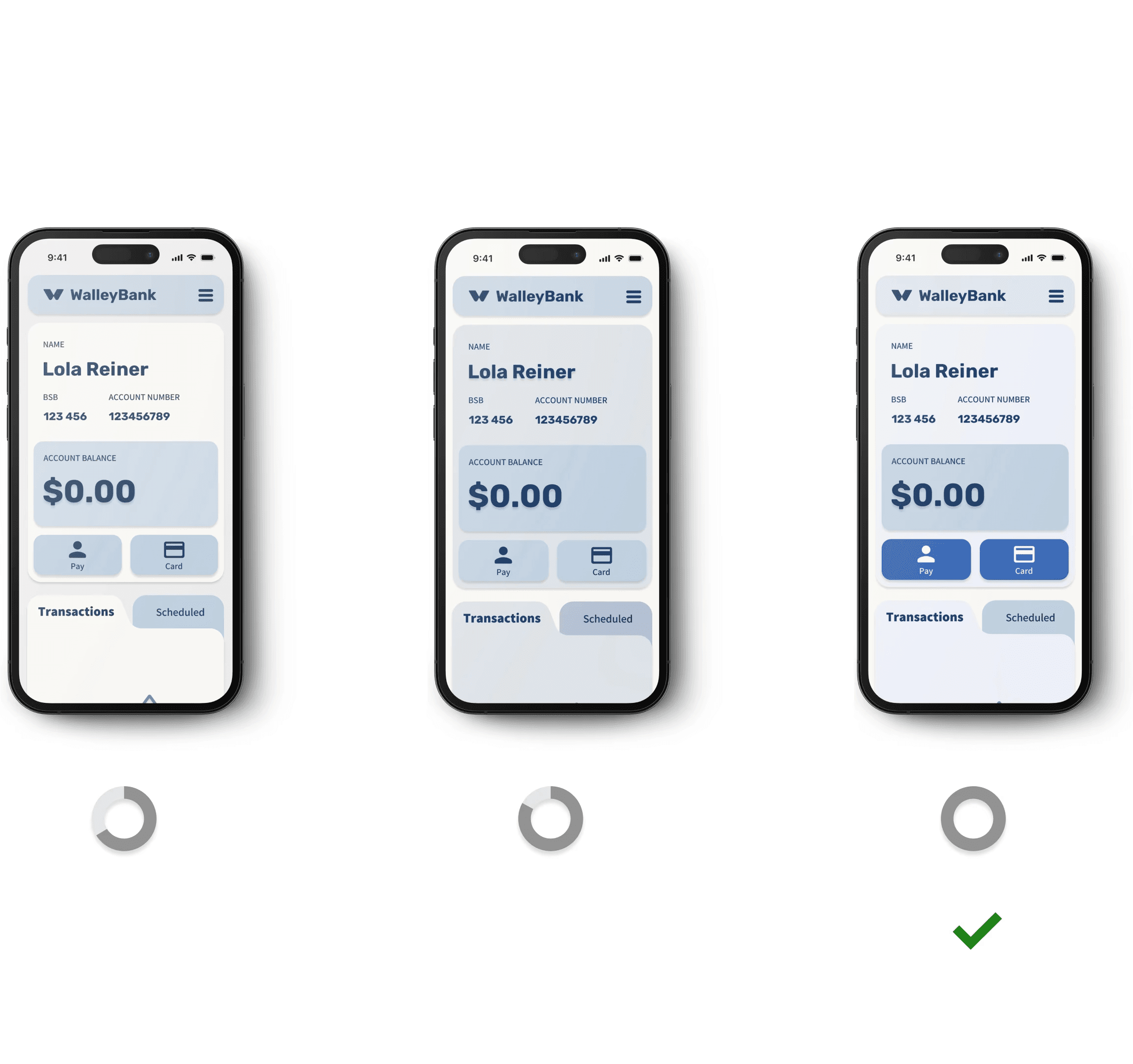I began by listening to users to uncover the root of the issue. The existing colour scheme created confusion, lacking the clarity and trust typically associated with effective banking interfaces. Users expressed a clear preference for blue, a colour widely recognised for its association with reliability, professionalism, and financial security — making it a stronger fit for WalleyBank’s brand goals.
