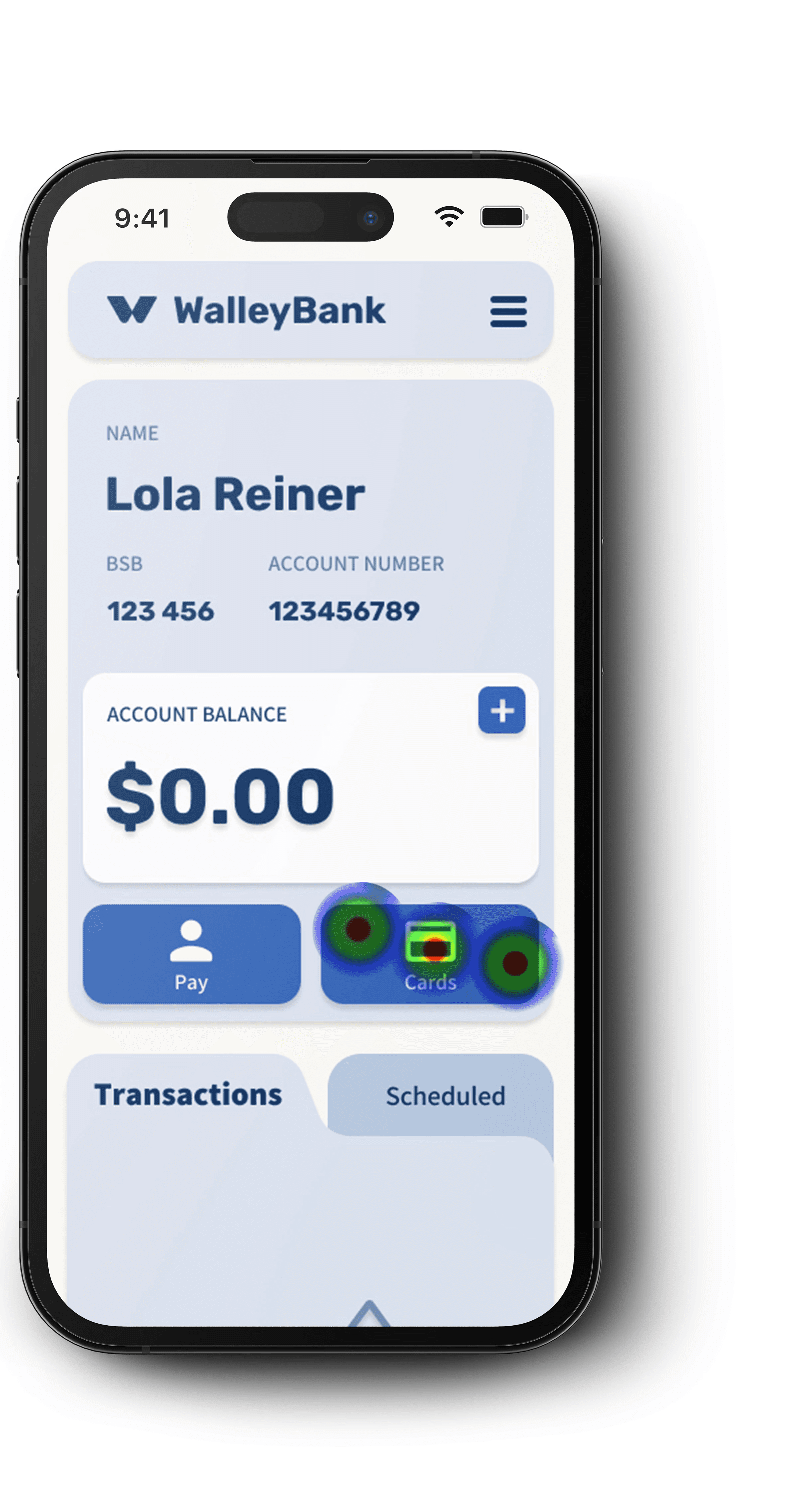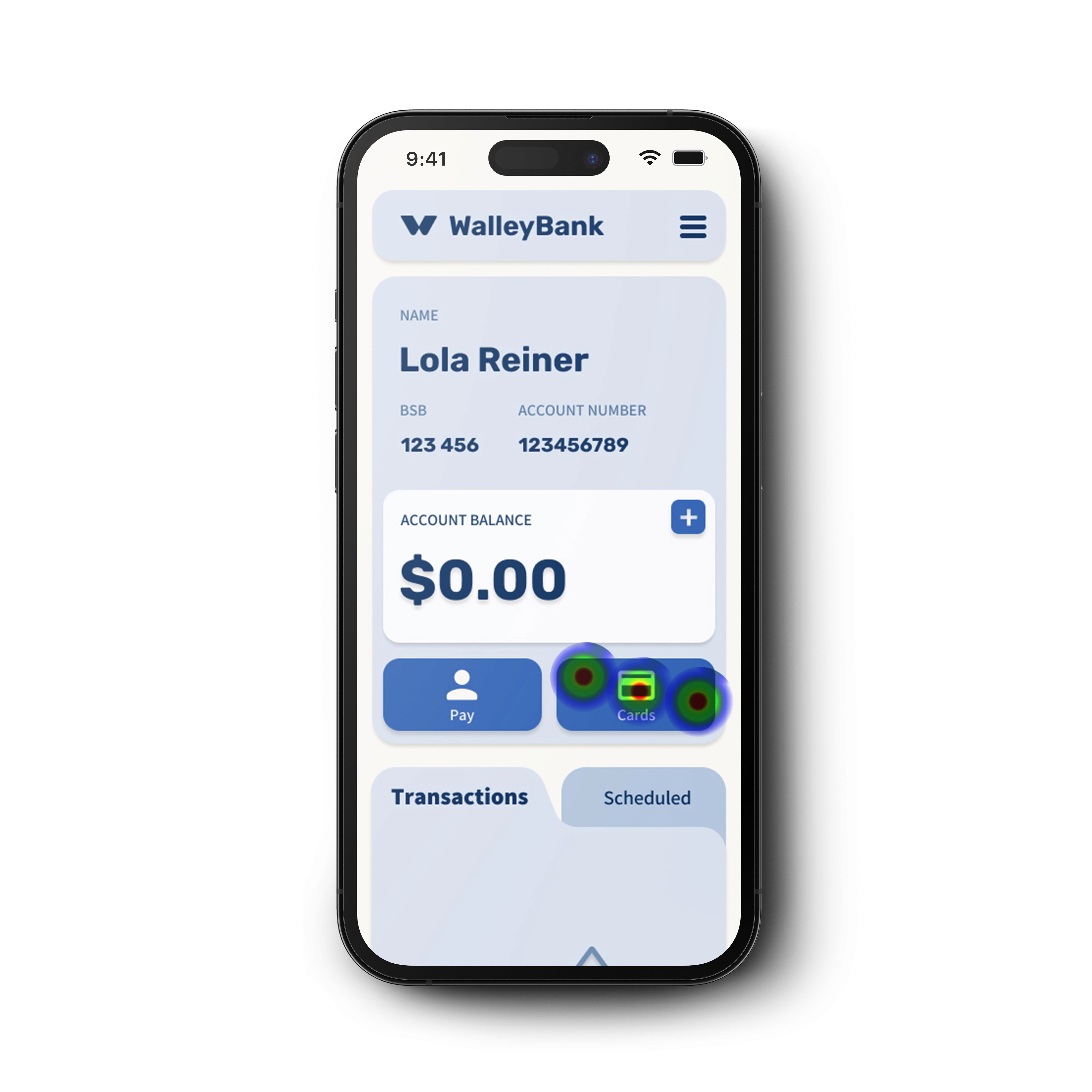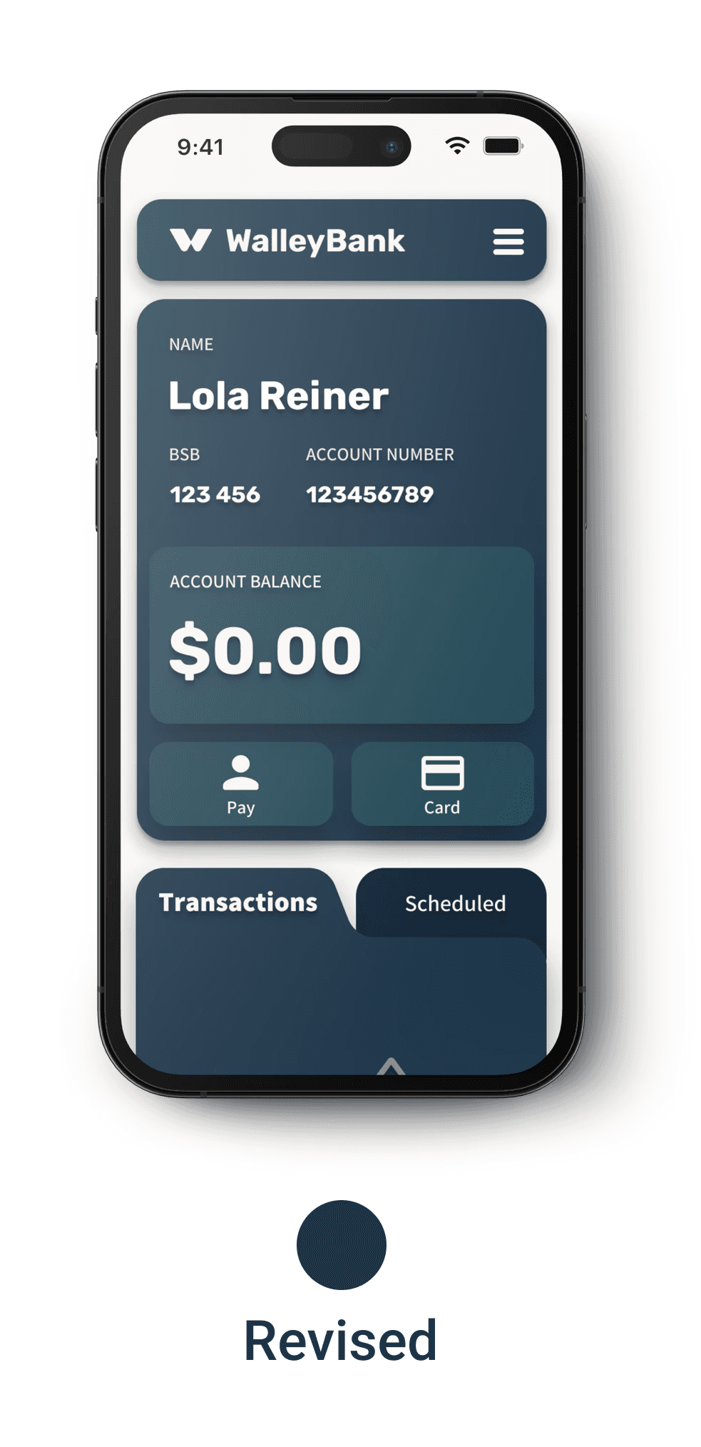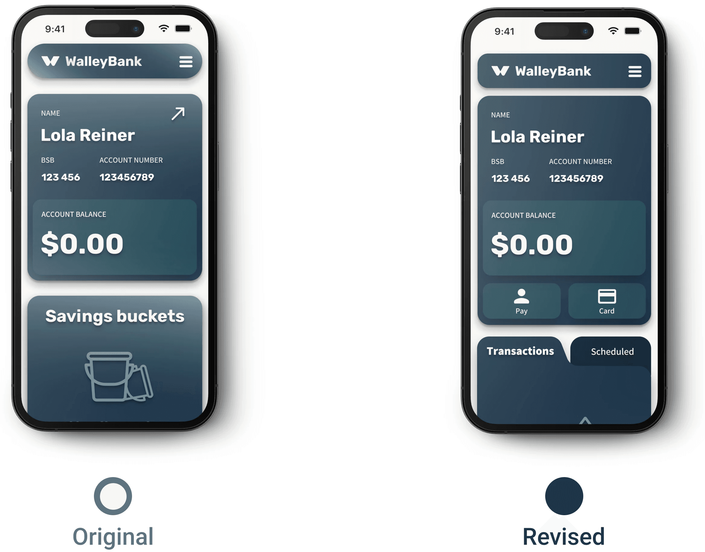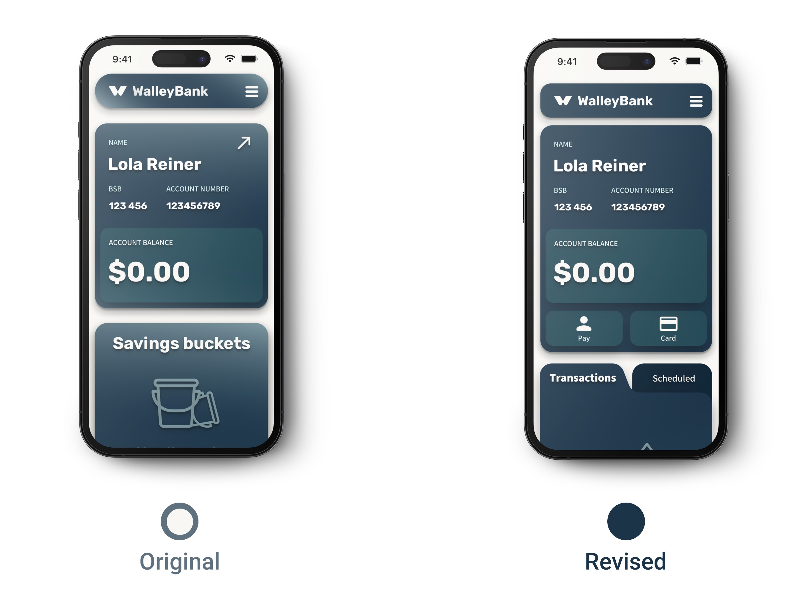 To enhance usability, I added Pay and Card buttons to the homepage, putting WalleyBank’s key features front and centre based on user feedback.