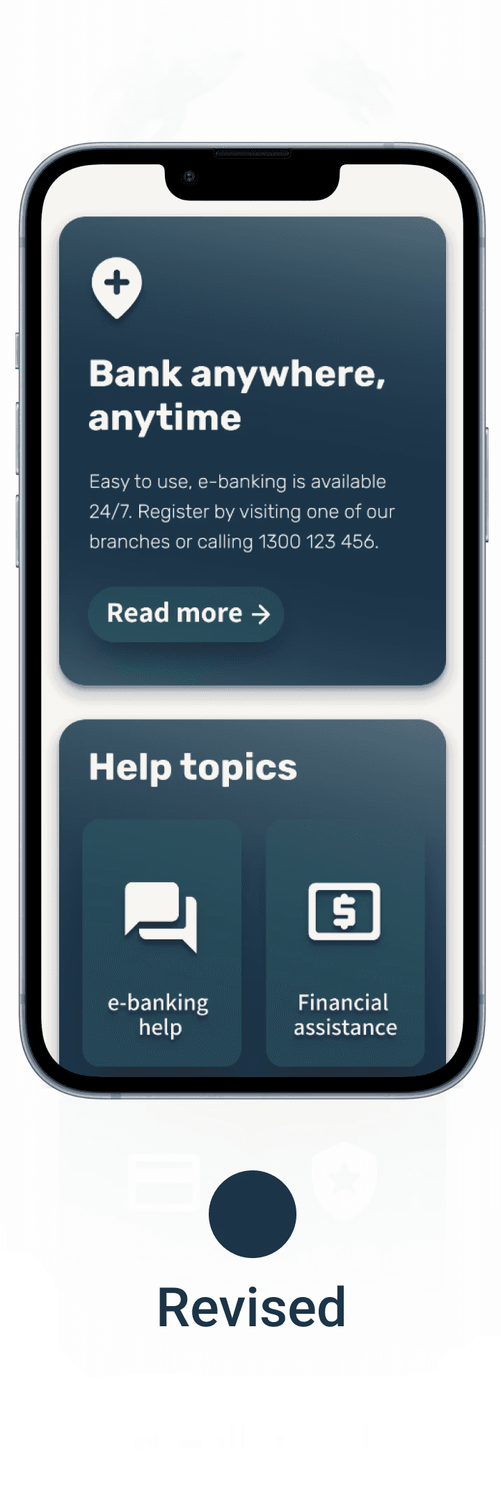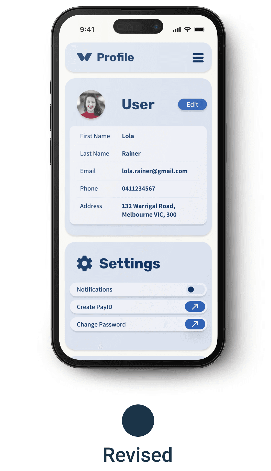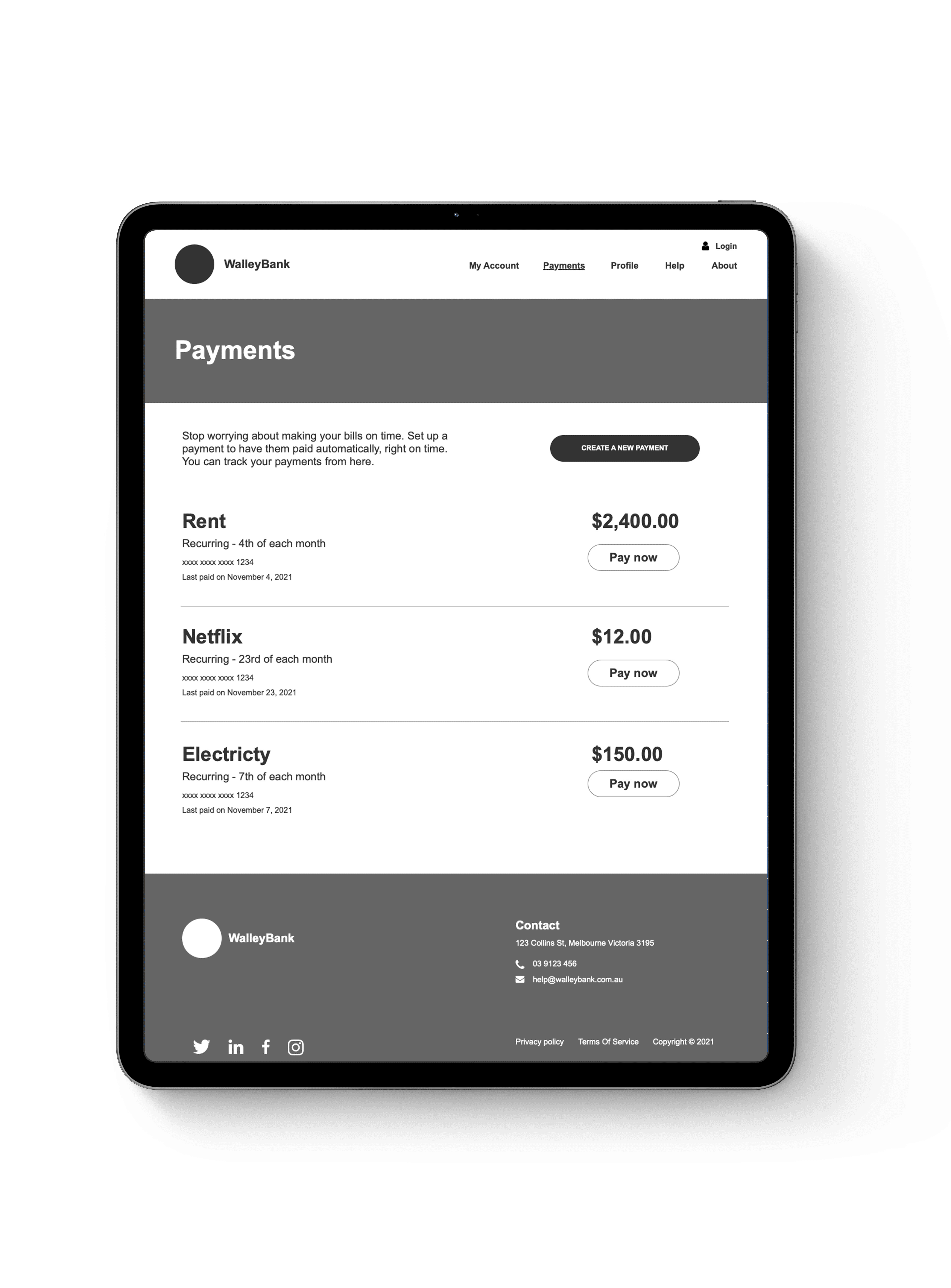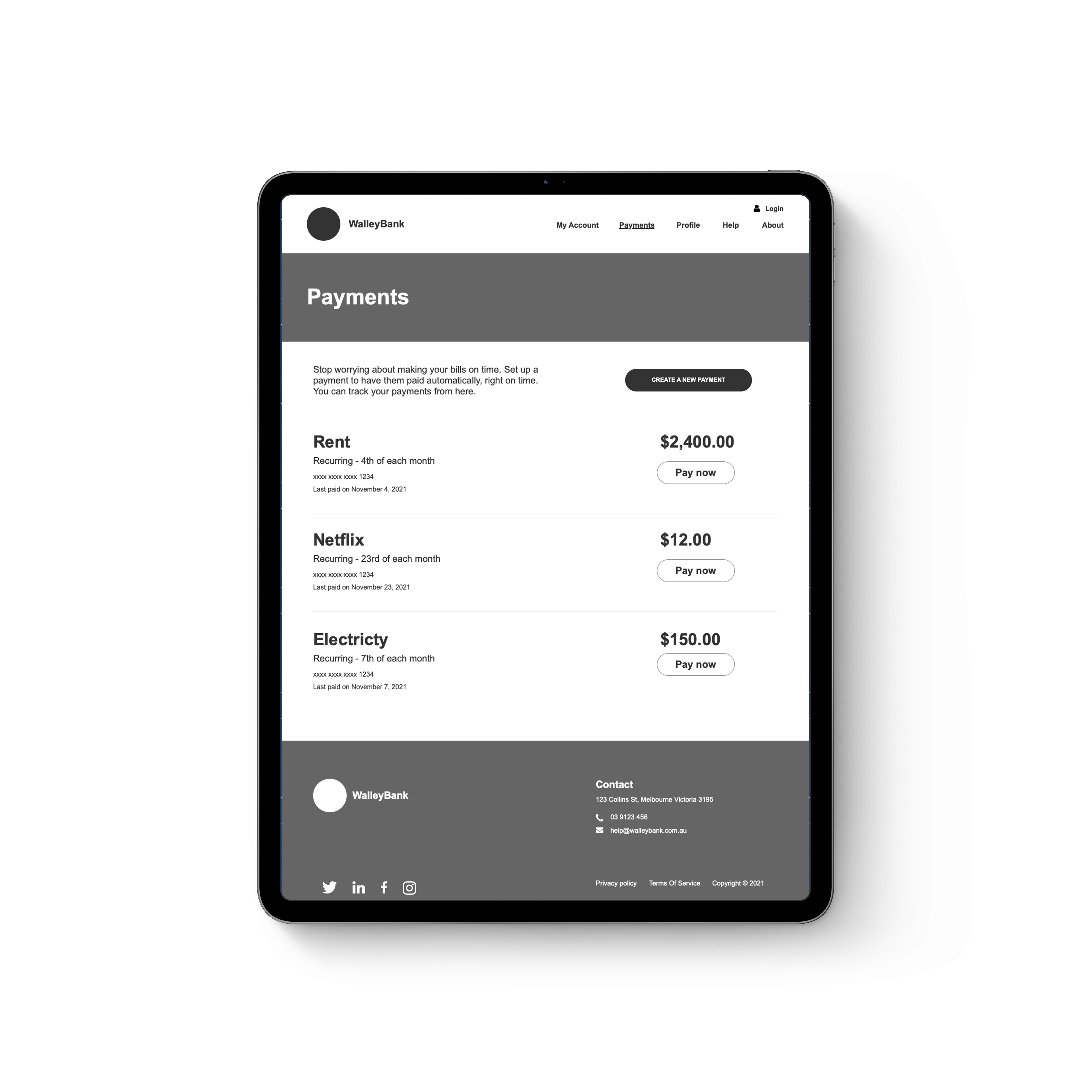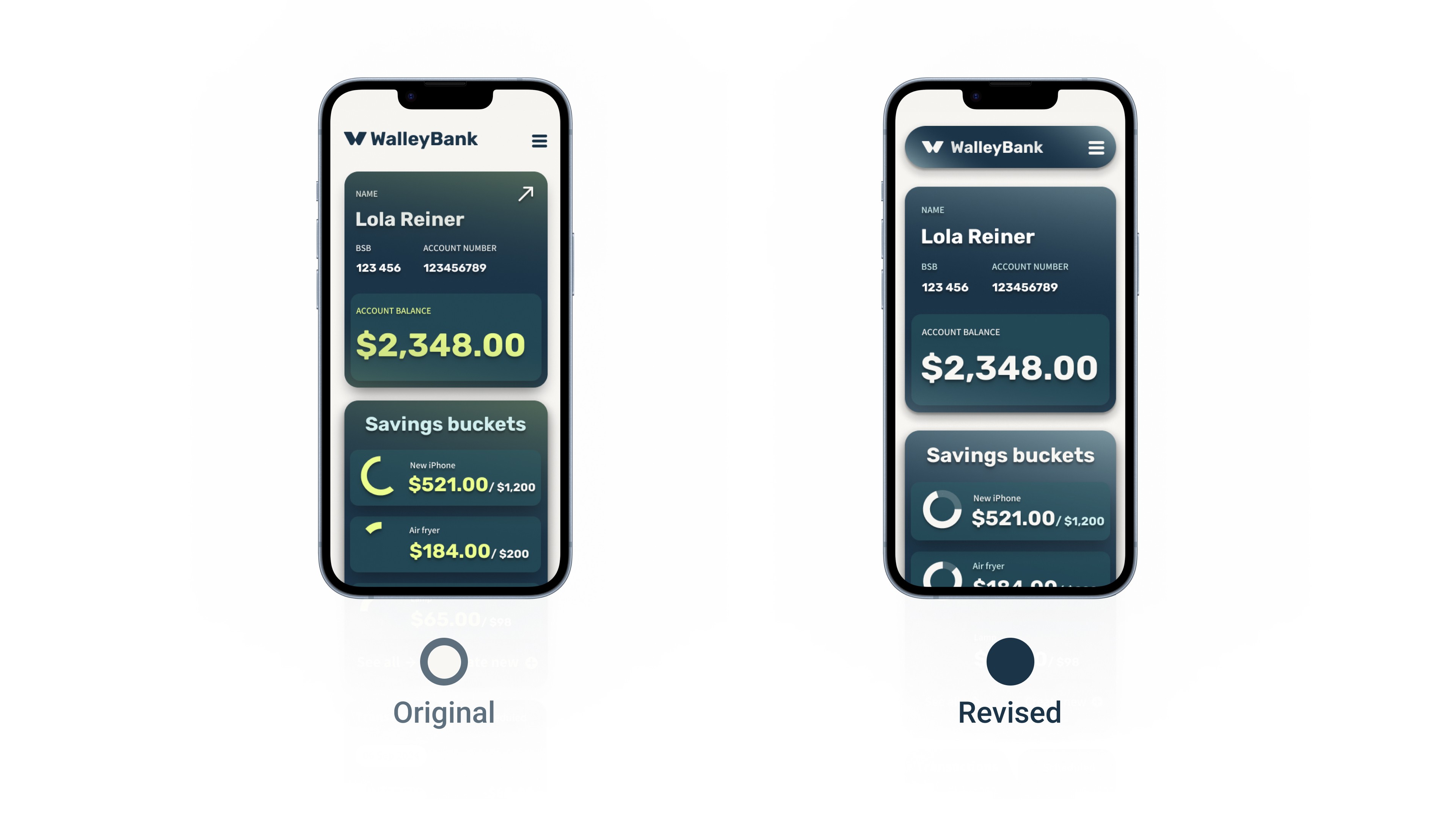 To enhance usability, I added Pay and Card buttons to the homepage, putting WalleyBank’s key features front and centre based on user feedback.