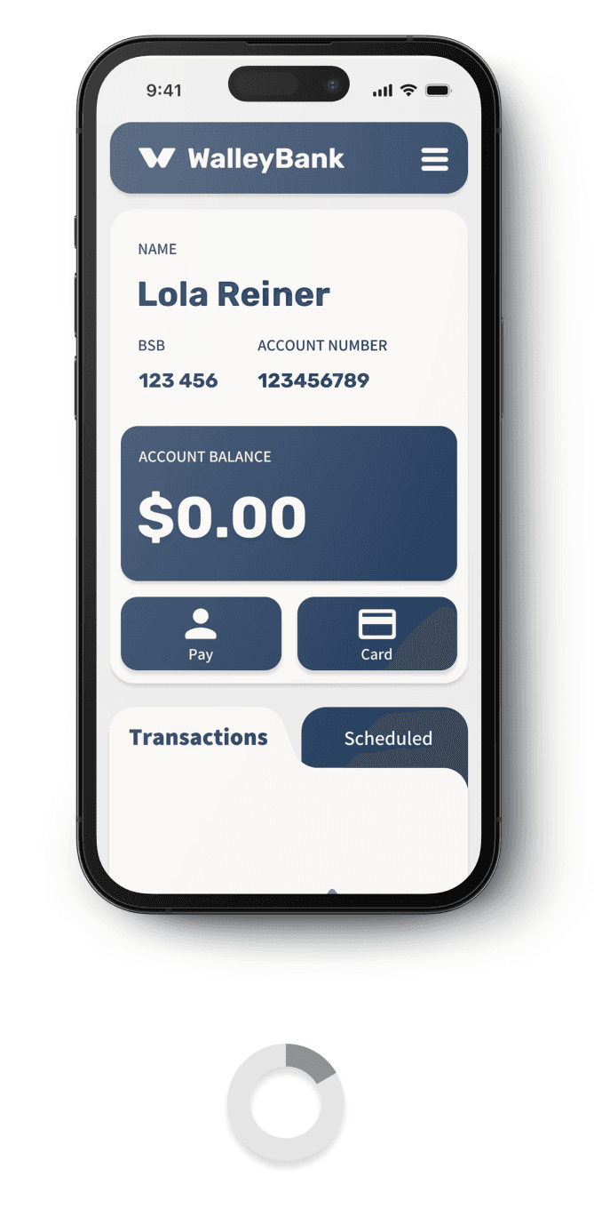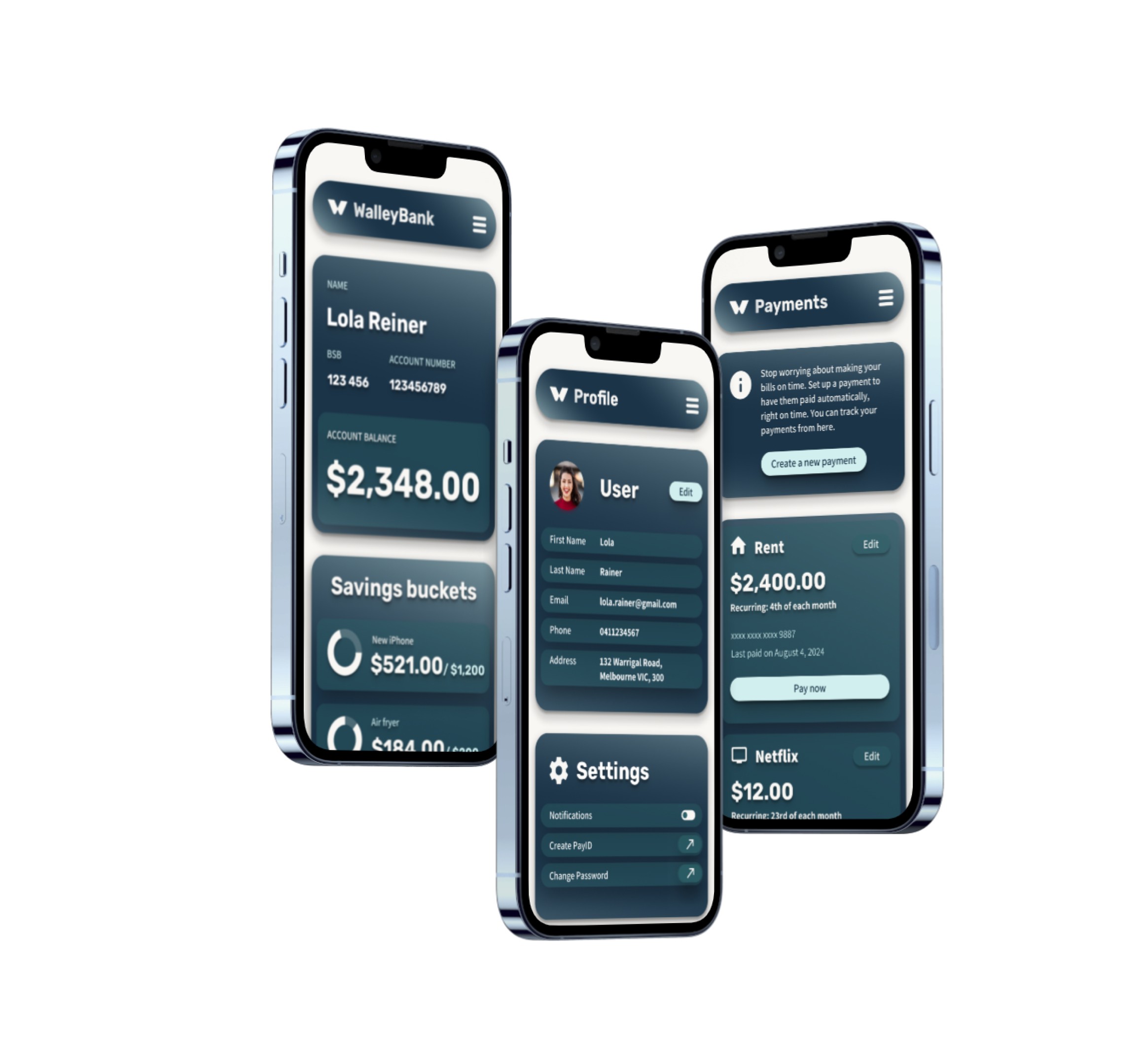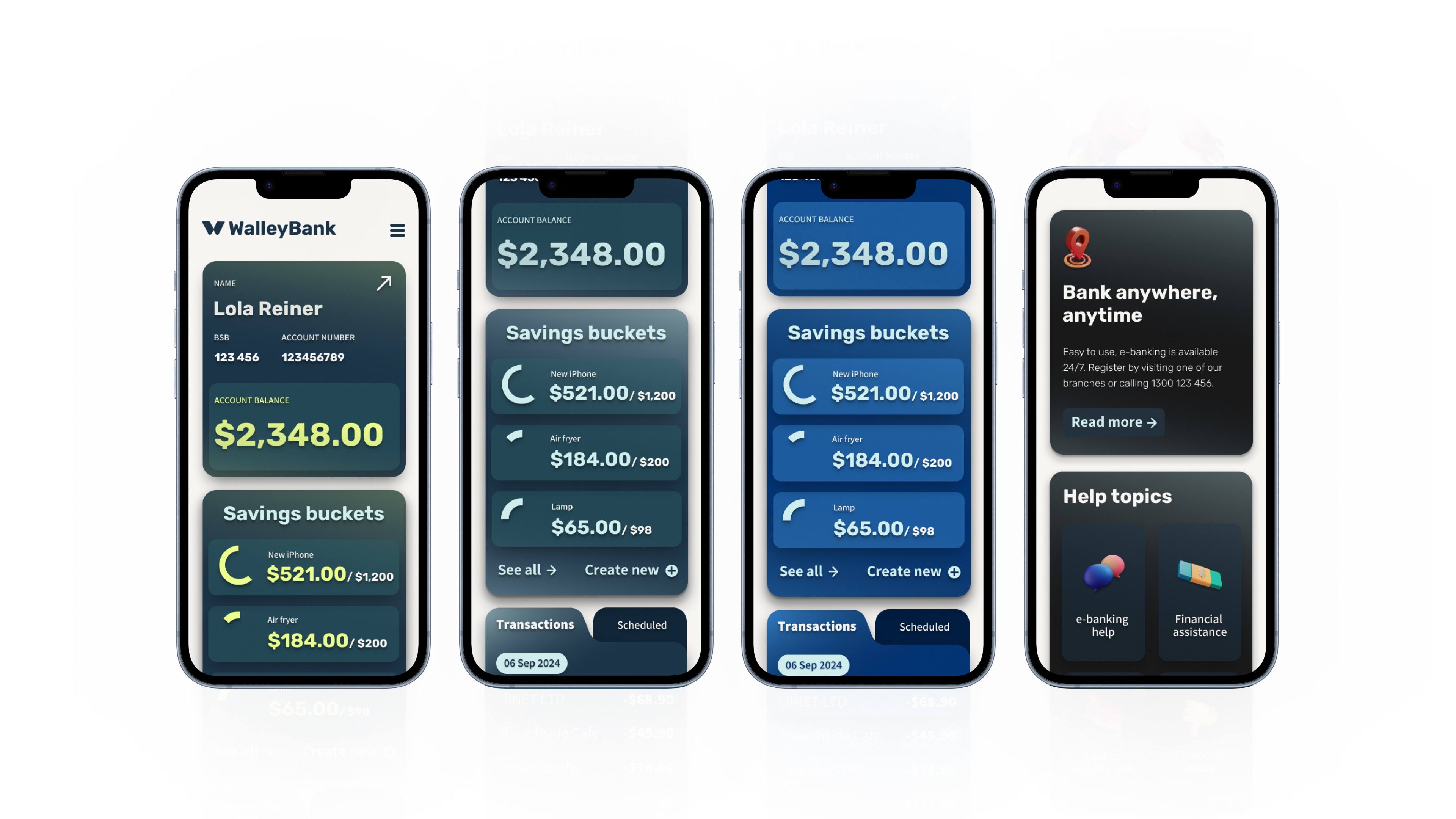 Create a visual language that reflects WalleyBank’s core values — approachable, secure, and forward-thinking. The UI should balance personality with professionalism, reinforcing user trust through consistent branding, thoughtful use of colour and typography, and a tone that feels both modern and human.