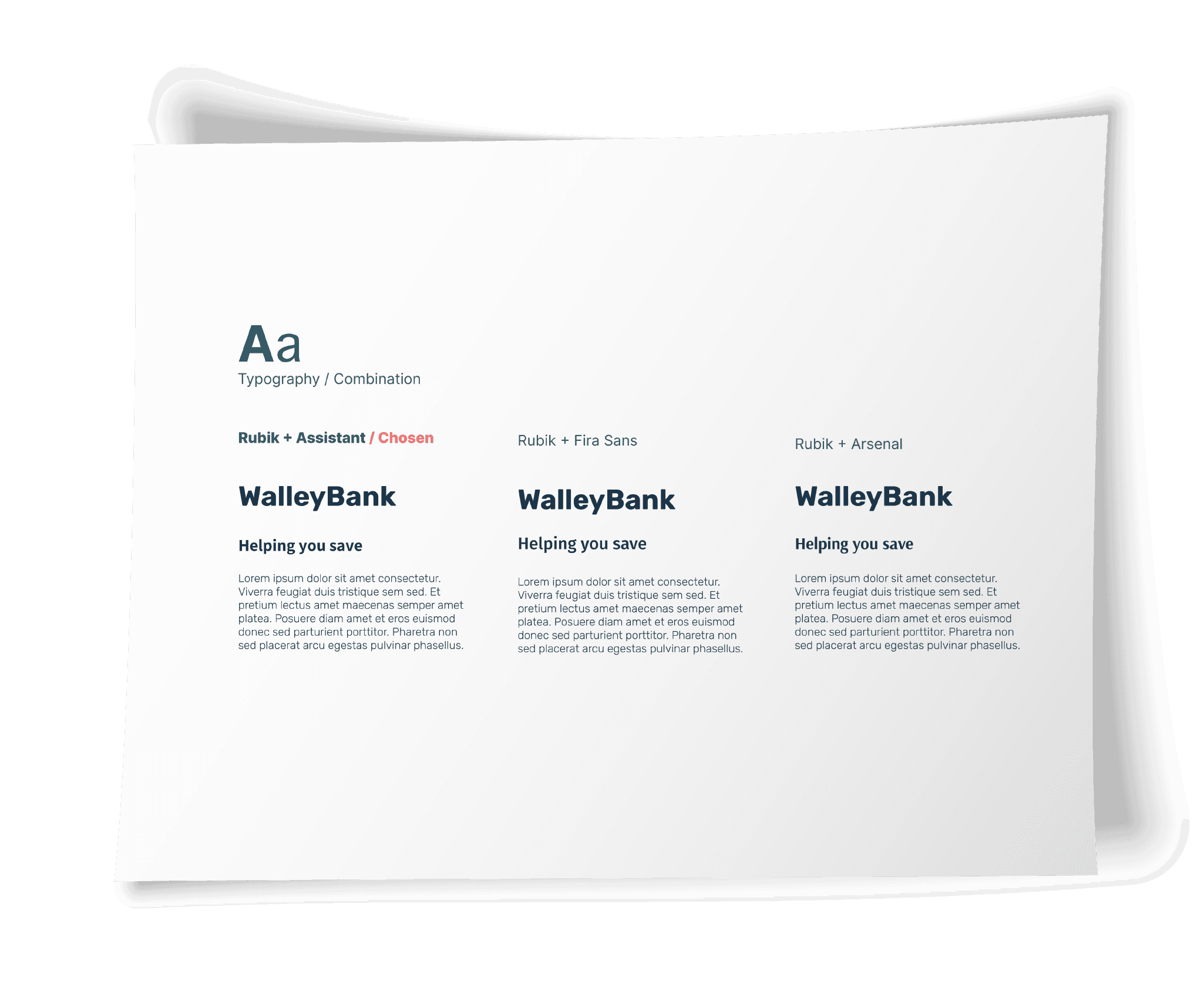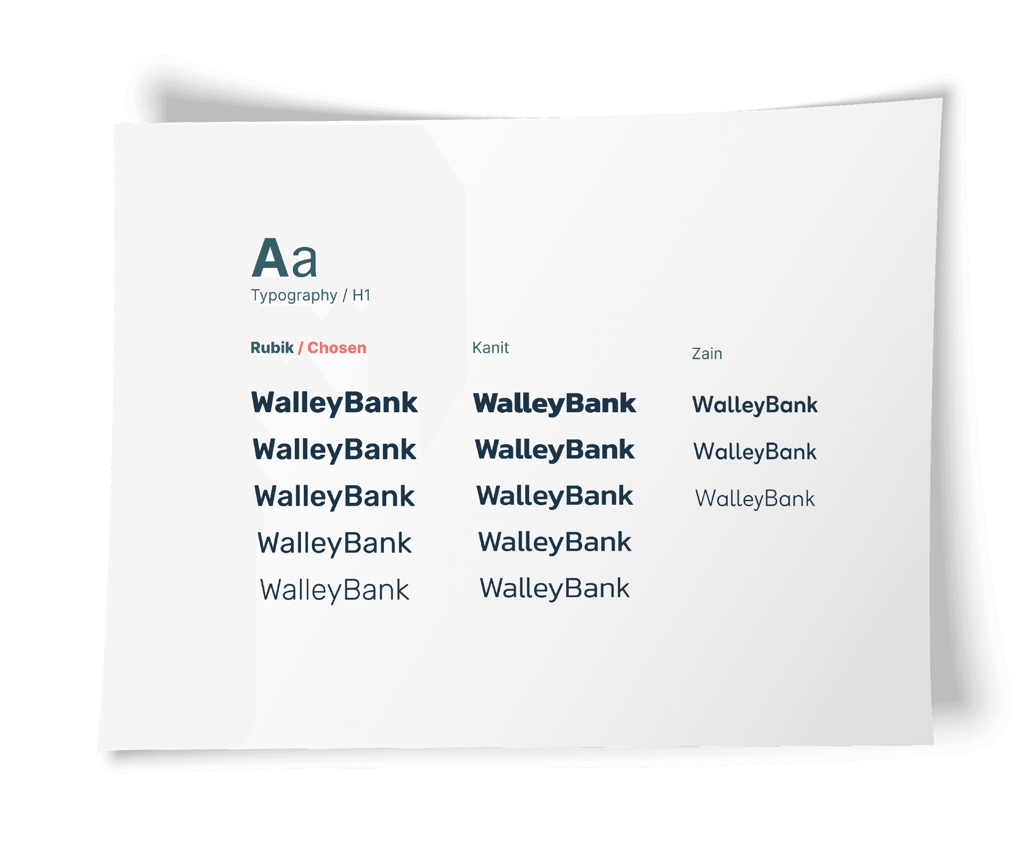 The moodboard sets the tone for a bold departure from traditional banking aesthetics — most notably through a refined monochromatic green palette, symbolising prosperity, growth, luck, and balance. This is paired with a clean, traditional sans serif typeface that grounds the brand and provides contrast to the more expressive, characterful heading style. Together, these elements lay the foundation for WalleyBank’s distinct visual identity: modern, approachable, and purposefully designed.