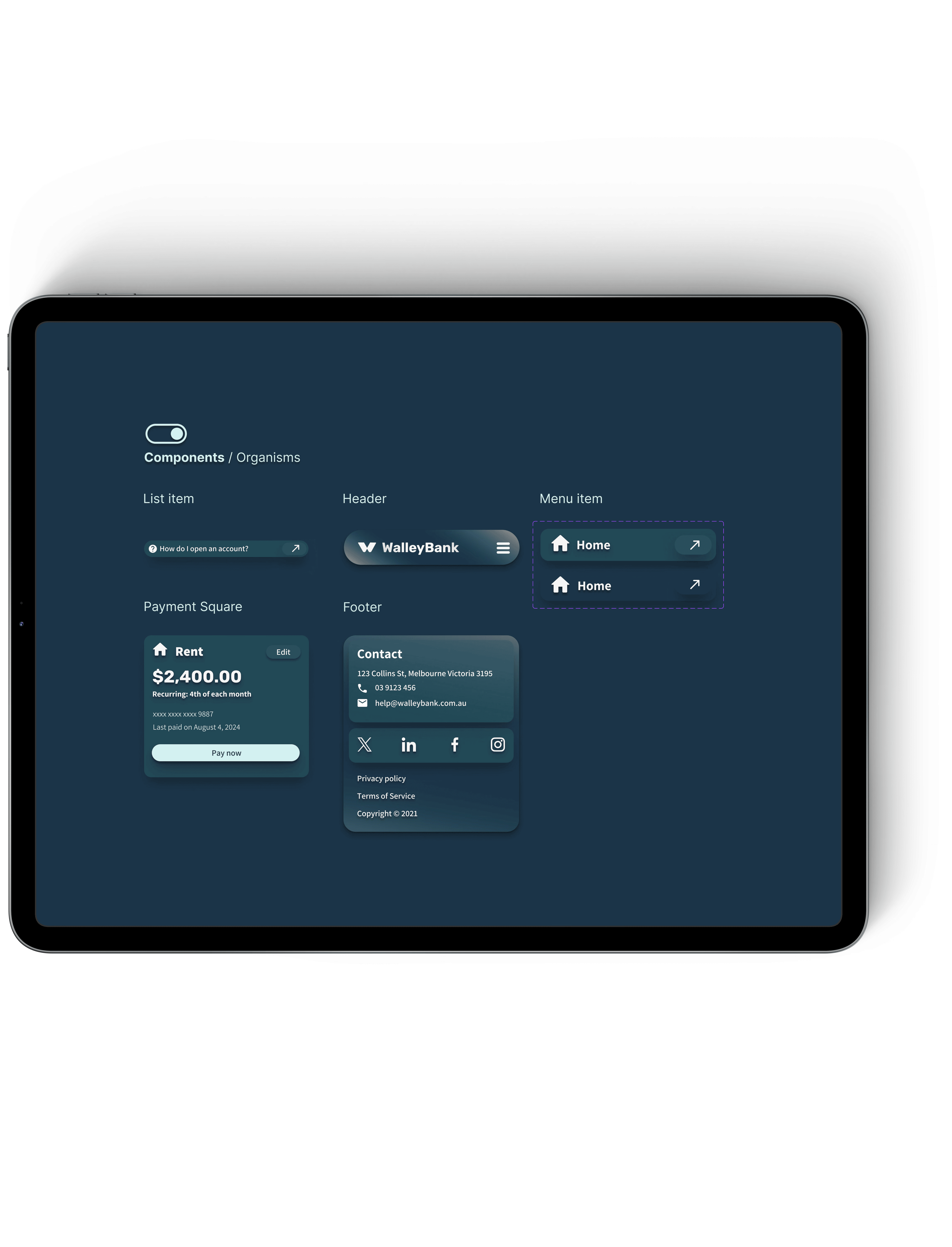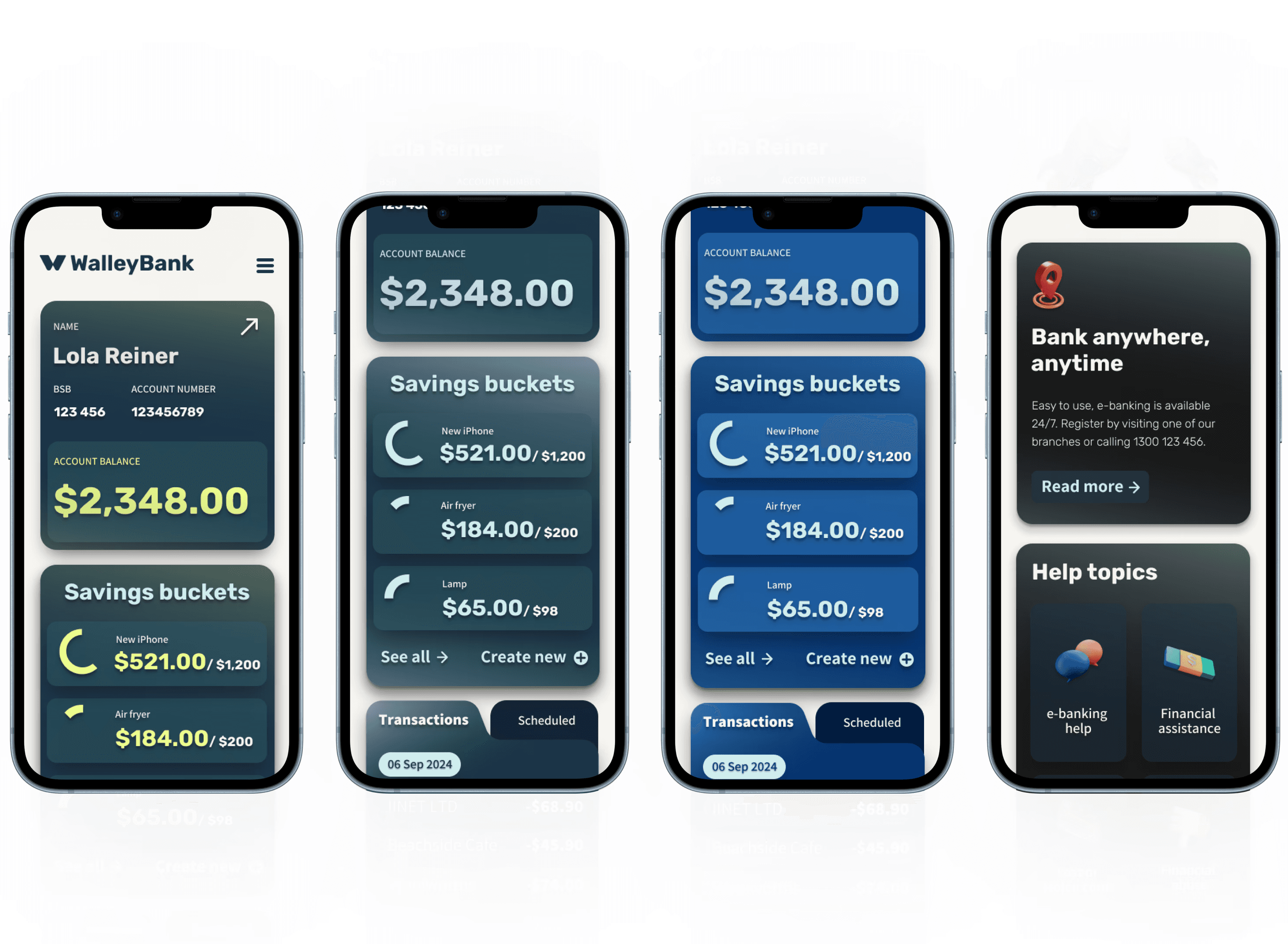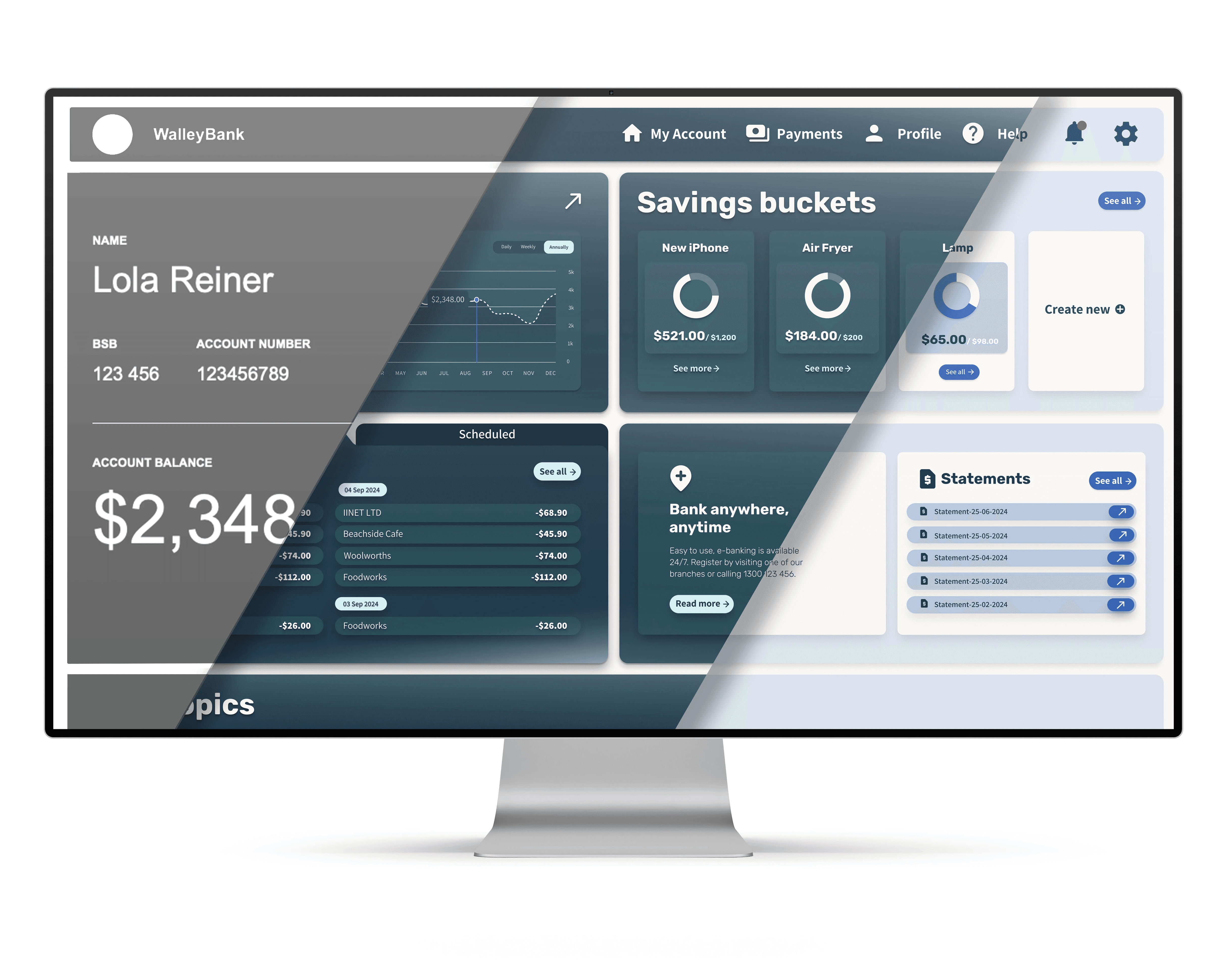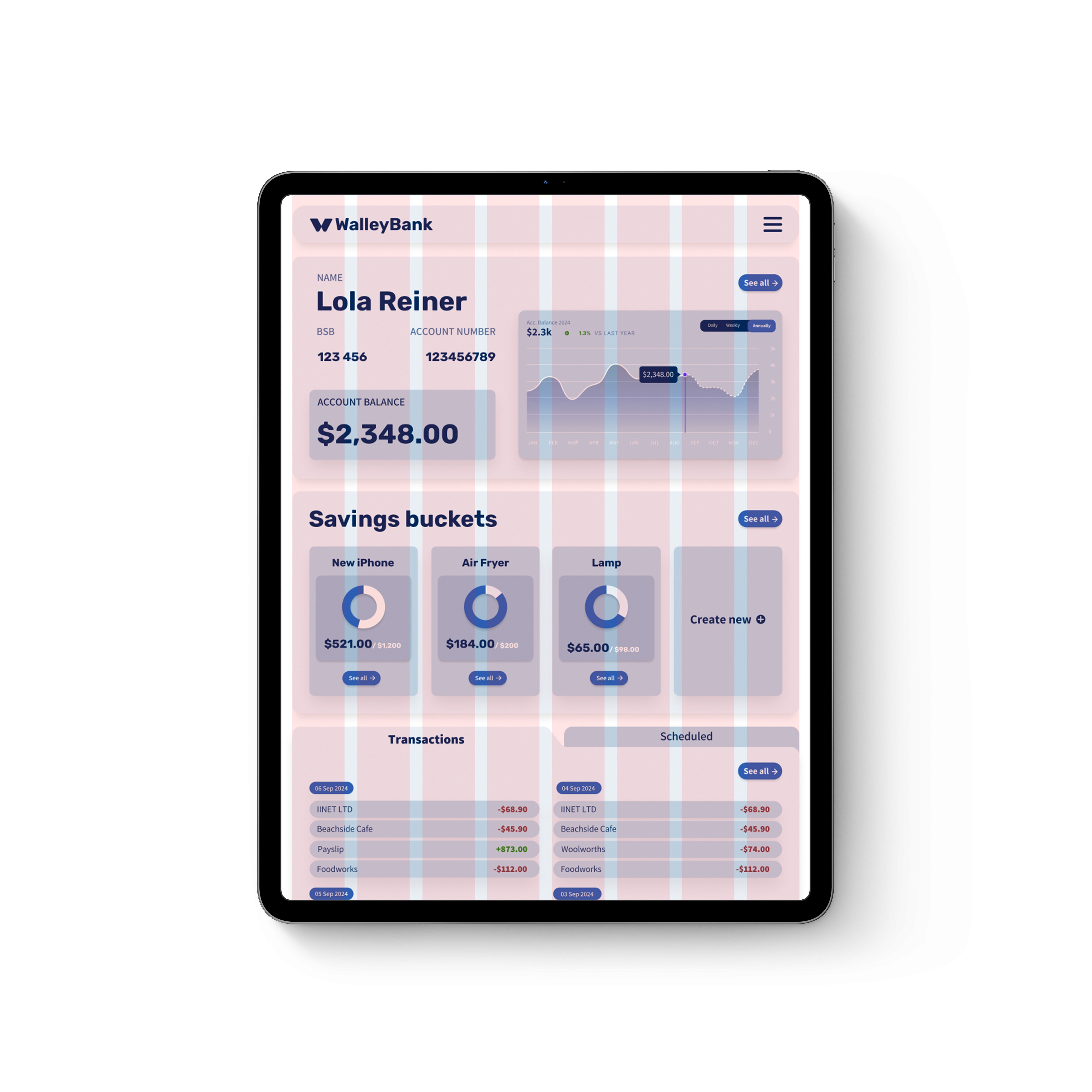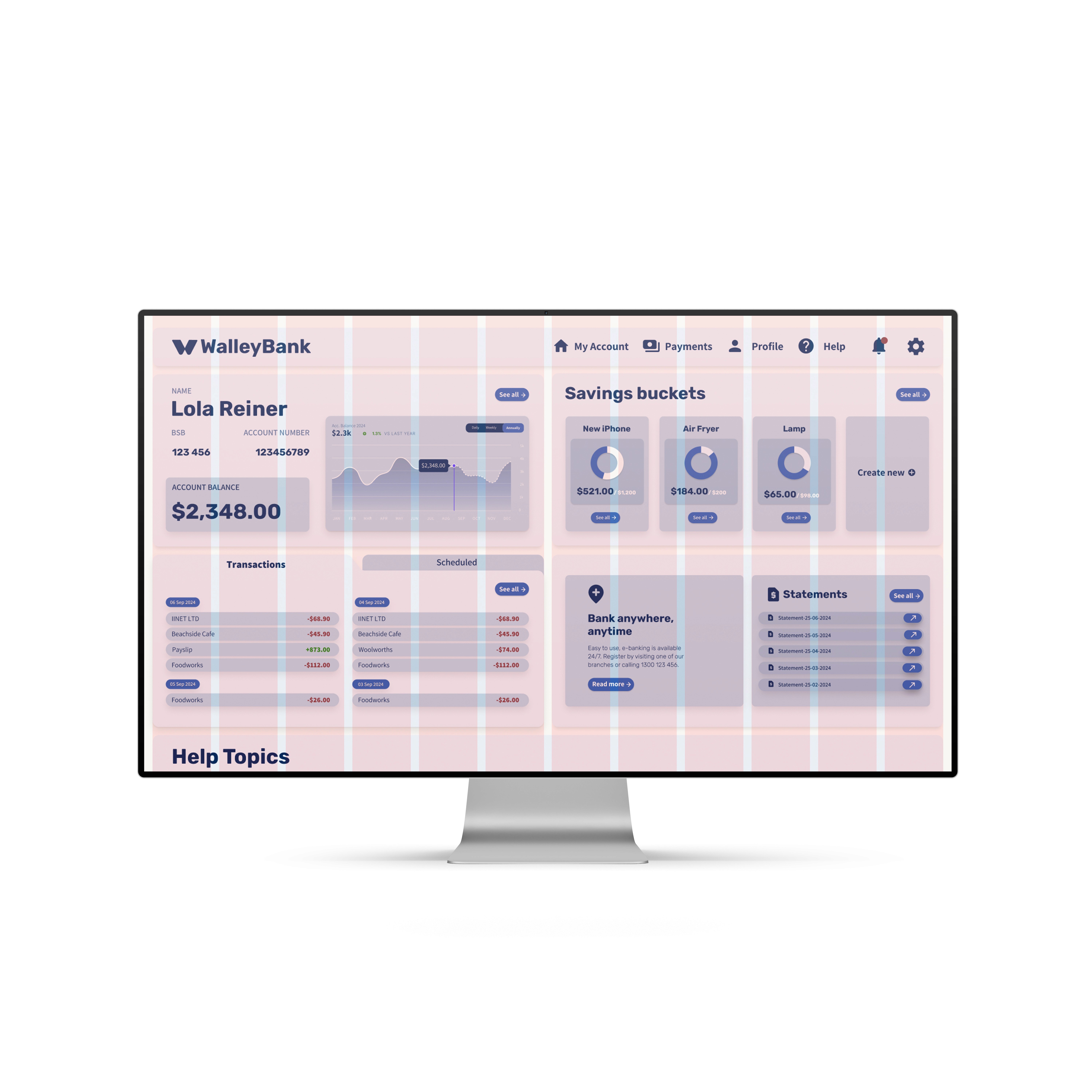 The WalleyBank brand and UI needed to break away from the rigid, overly serious identity of traditional corporate banks. The goal was to introduce a fresh, lighthearted tone that still felt trustworthy but brought optimism, clarity, and a more relaxed, modern experience to everyday banking. Designed with the Australian user in mind, WalleyBank reimagines banking as something approachable, intuitive, and genuinely enjoyable. Let's start to put together the design elements to achieve this…