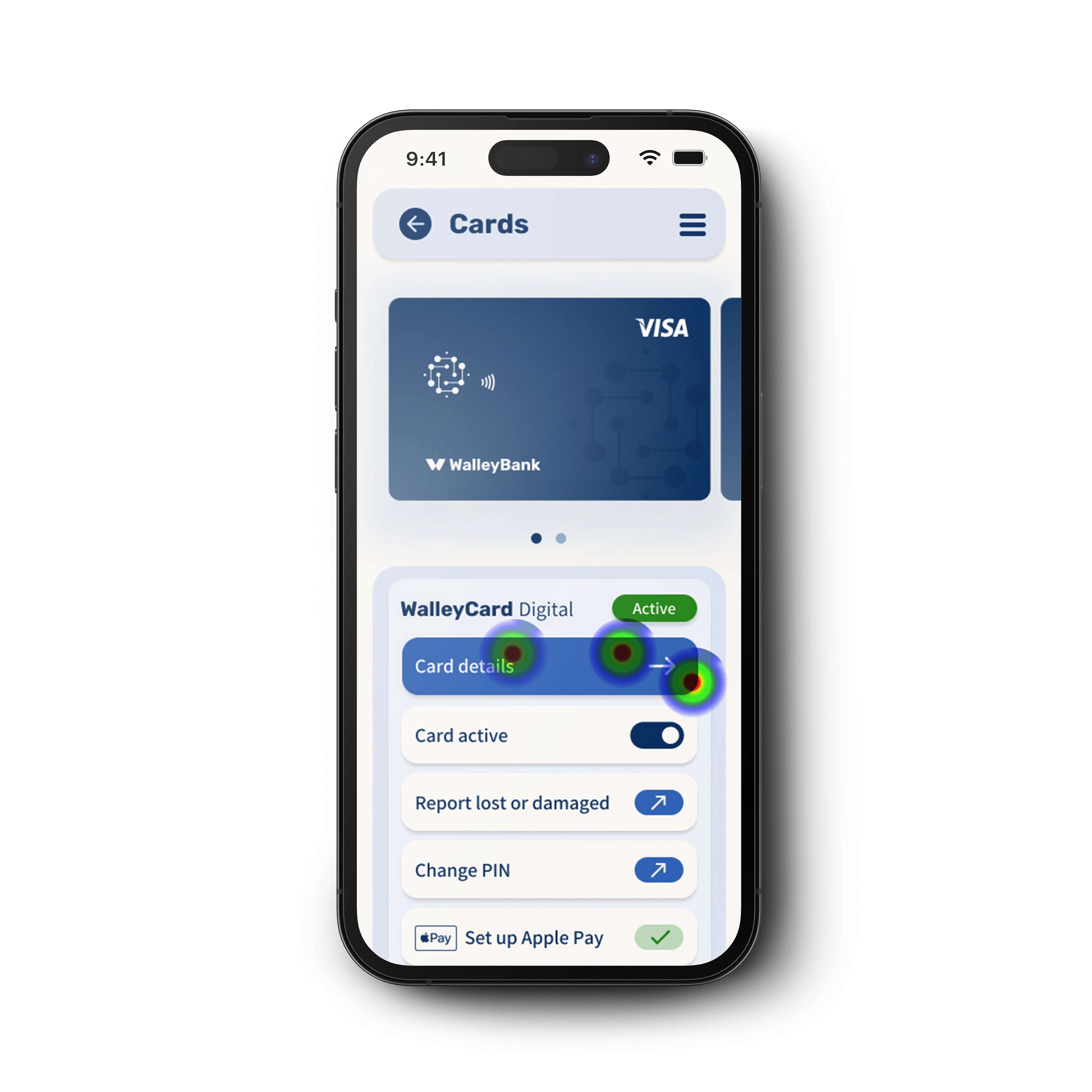 Heatmap analysis reveals surgical precision throughout the interaction pattern concentrated on the card management and details buttons. The 9.2% misclick rate confirms that the information architecture aligns with user mental models, ensuring that sensitive card data is accessible and exactly where users expect it to be.