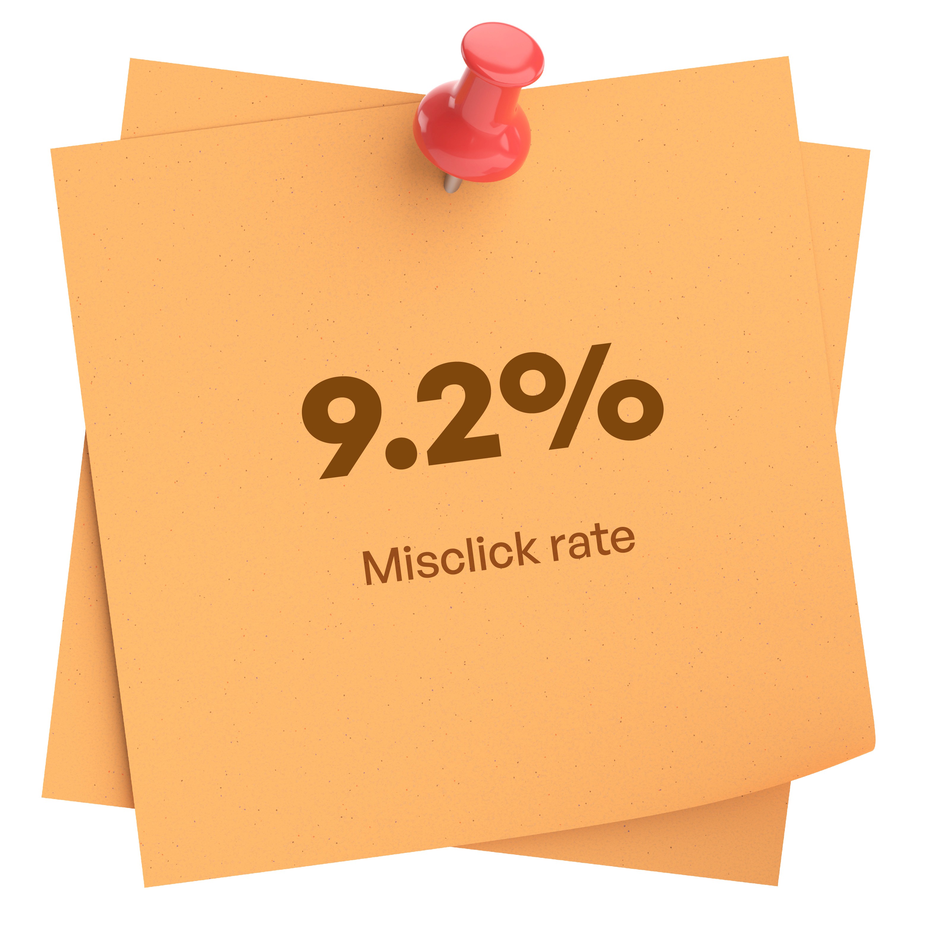 The Insight: A 9.2% misclick rate remains below the critical 10% benchmark for primary navigation. This validates that the visual signifiers were precise enough to guide users through security layers without causing "choice paralysis" often seen in older banking applications.