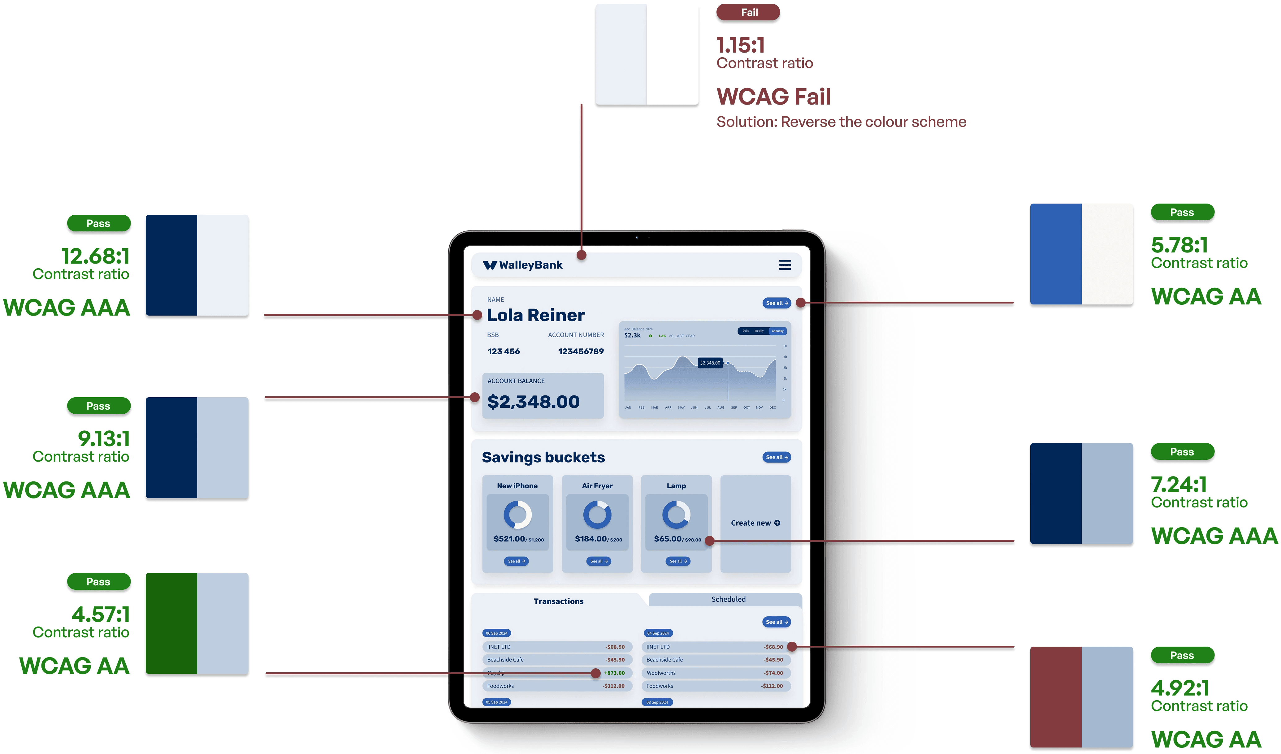 With the new colour scheme finalised, it was time to give the original design a cohesive facelift — using the 60/30/10 rule to strategically guide colour application across the updated WalleyBank platform. This approach ensured visual balance, enhanced hierarchy, and reinforced brand identity throughout the interface.